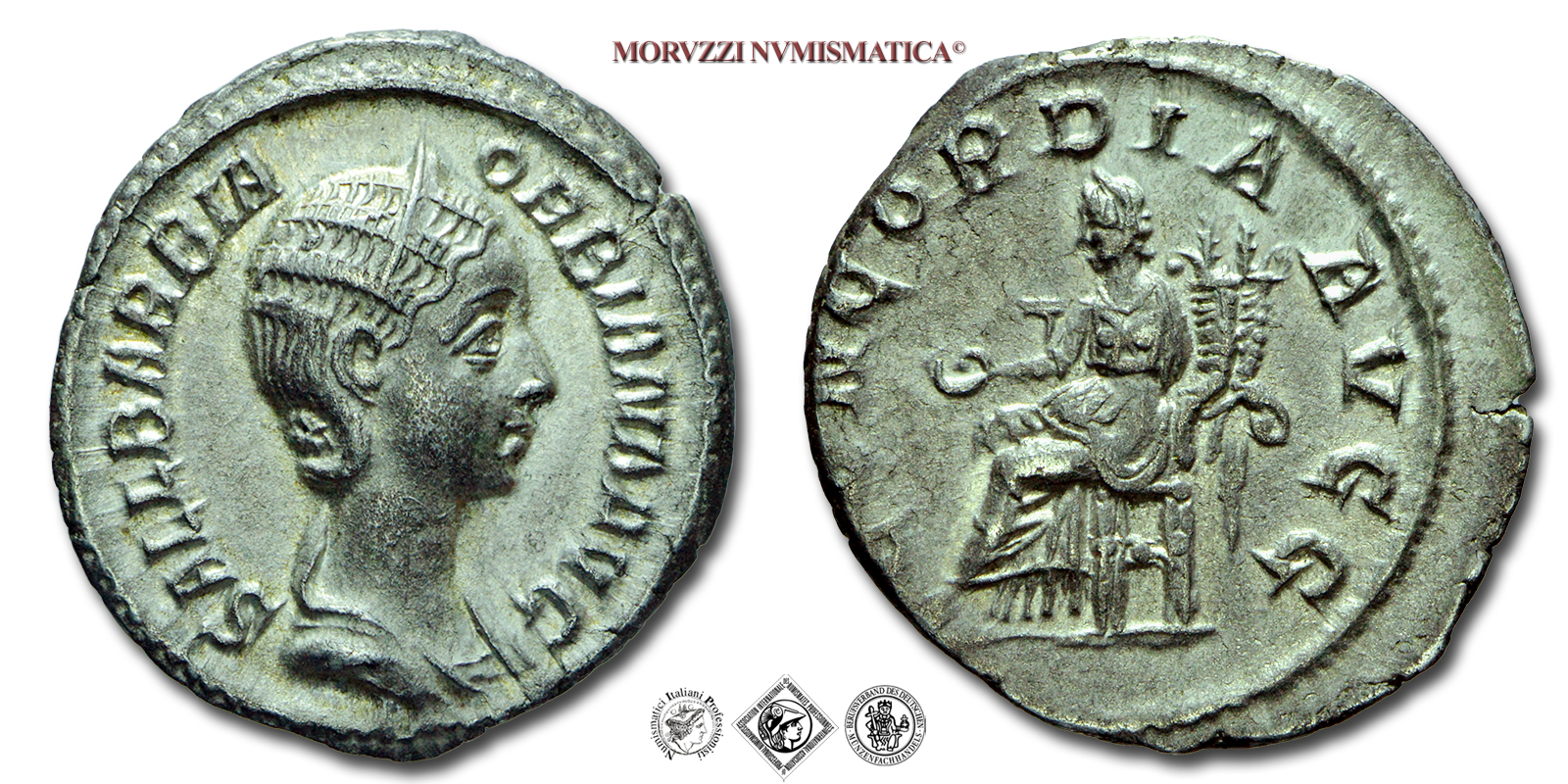 Impero Romano, ORBIANA, Moglie di Alessandro Severo, 222-235 d.C., DENARIO, Emissione: Dopo il 225 d.C., D/ SALL BARBIA ORBIANA AVG, busto diademato e ammantato a destra, R/ CONCORDIA AVGG, la Concordia seduta sul trono a sinistra con patera nella mano destra e doppia cornucopia nella sinistra, Zecca di Roma, Rif. bibl. R.I.C., 319/S; Cohen, 1/Fr. 20; Metallo: AR, gr. 2,93, (MR154206), Diam.: mm. 19,18, SPL, (R)