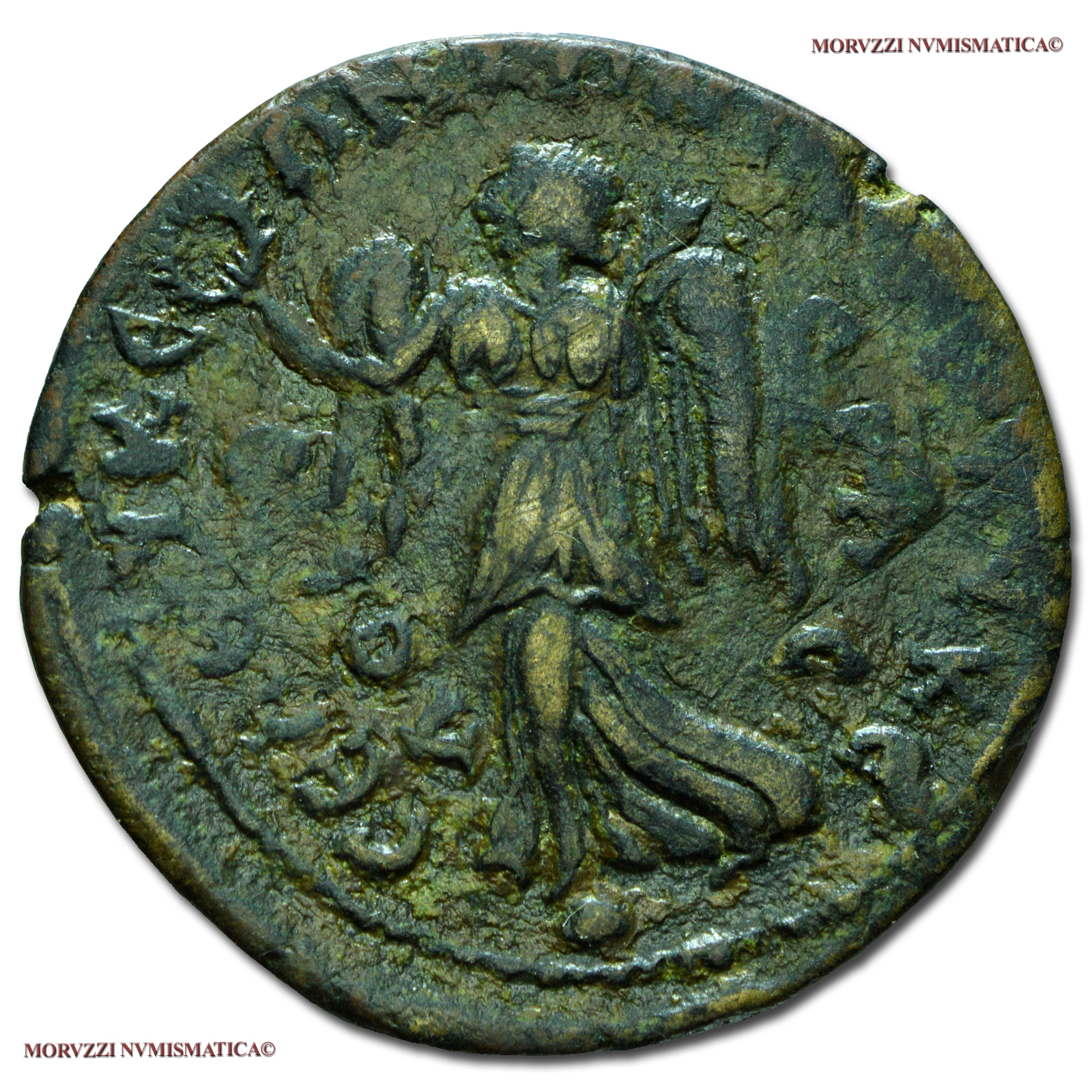 La moneta è molto usurata e, se i rilievi originariamente erano poco rilevati, alcune parti dell’esemplare possono non essere leggibili.