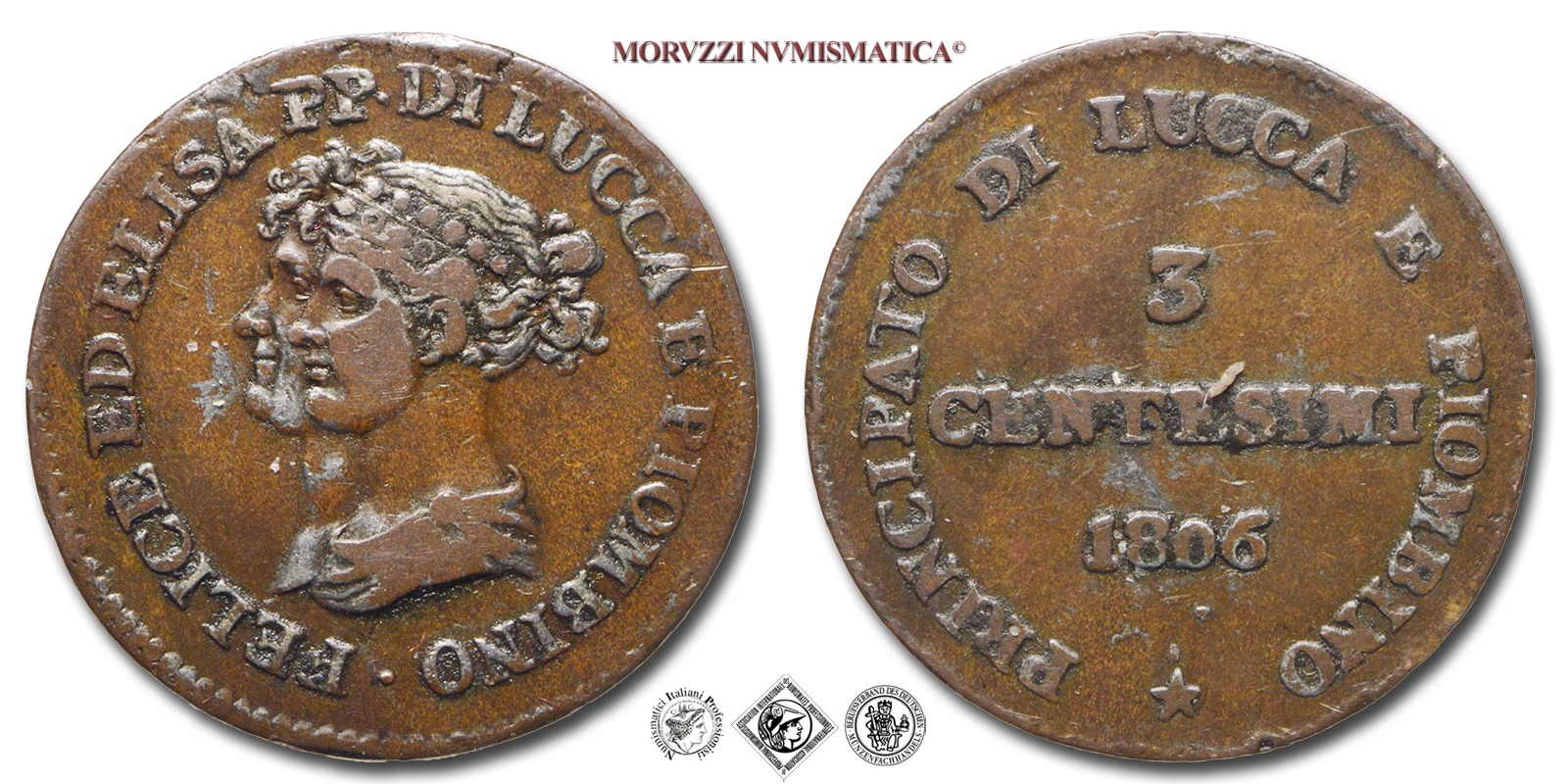 Principato di Lucca e Piombino, ELISA BONAPARTE E FELICE BACIOCCHI, 1805-1814, CENTESIMI 3, Emissione: 1806, D/ FELICE ED ELISA PP • DI LUCCA E PIOMBINO •, busti di Elisa Bonaparte e Felice Baciocchi rivolti a sinistra, R/ Nel campo il valore (3 CENTESIMI) e il millesimo (1806) su tre righe. Intorno PRINCIPATO DI LUCCA E PIOMBINO, sotto stella a cinque punte, Zecca di Firenze, Rif. bibl. Pagani, 260; Metallo: AE, gr. 6,19, (MI158264), Diam.: mm. 23,38, BB, (NC)