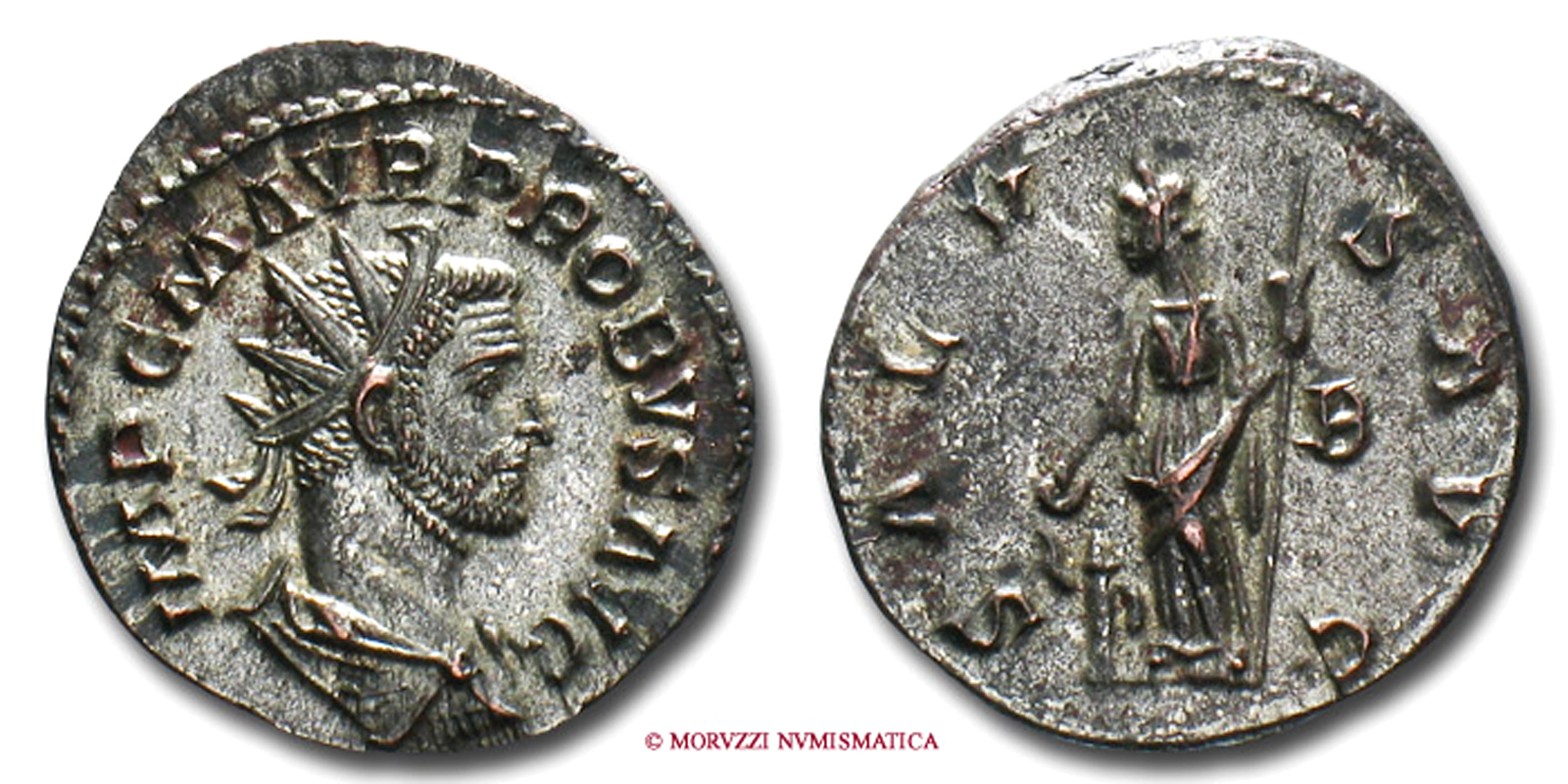 PROBO, 276-282 d.C., ANTONINIANO, Emissione: 276-282 d.C., Zecca di Lugdunum, Rif. bibl. R.I.C., Cfr.123 var.; Cohen, 567; Metallo: AE argentato, gr. 4,38, (MR105570), Diam.: mm. 22,11, SPL, (RR)