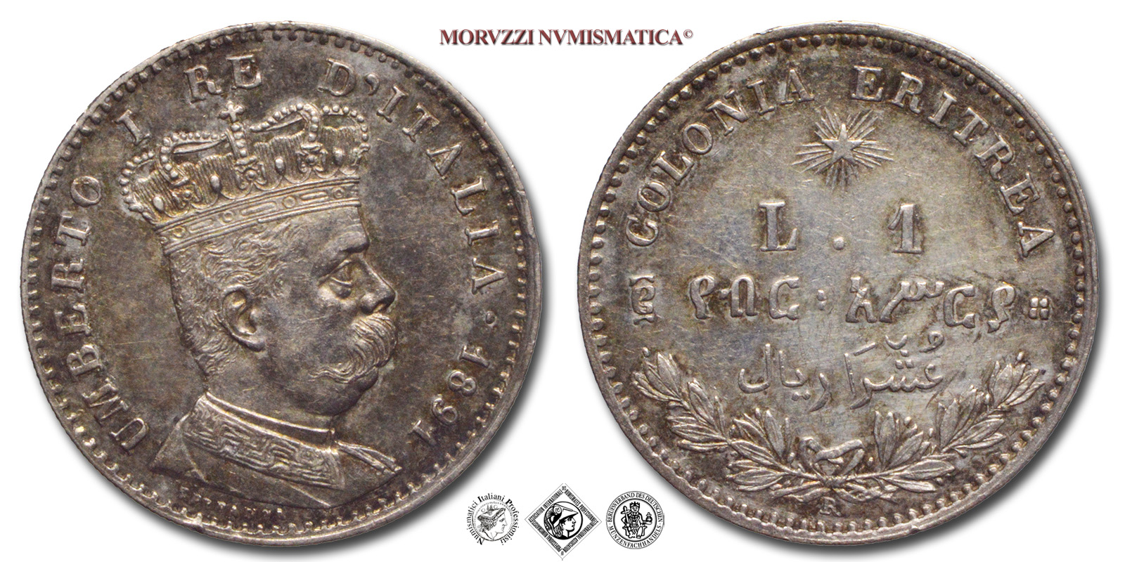 Regno d'Italia, Colonia Eritrea, UMBERTO I, 1878-1900, LIRA, Emissione: 1891, D/ UMBERTO I RE D'ITALIA • e il millesimo (1891), semibusto in uniforme del Re con corona a destra; sotto il busto, indicazione dell'autore (SPERANZA), R/ nel campo indicazione del valore in italiano (L. 1), arabo ed amarico su tre righe sotto la stella italiana. Lungo il bordo, in alto, COLONA ERITREA, in basso, rami di alloro intrecciati con un fiocco al di sotto del quale vi è il segno di zecca (R), Zecca di Roma, Rif. bibl. Pagani, 635; Metallo: AR, gr. 4,99, (MI145099), Diam.: mm. 23,29, mSPL, (R)