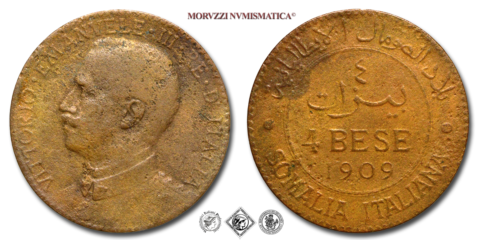 Regno d'Italia, Somalia Italiana, VITTORIO EMANUELE III, 1909-1925, BESE 4, Emissione: 1909, D/ Semibusto del Re in uniforme visto di fronte ma volto a sinistra. Lungo il bordo la scritta VITTORIO • EMANVELE • III • RE • D'ITALIA • e ad ore 5 il nome dell'autore in incuso (L • GIORGI), R/ Nel campo indicazione del valore (4 BESE) e del millesimo (1909) sia in italiano che in arabo all'interno di un cerchio. Intorno SOMALIA ITALIANA nella parte inferiore e in arabo nella parte superiore; le due scritte sono separate da due rosette. Sotto la data in caratteri latini, il segno di zecca (R •), Zecca di Roma, Rif. bibl. Pagani, 973; Metallo: CU, gr. 9,13, (MI160032), Diam.: mm. 29,93, MB, (R)