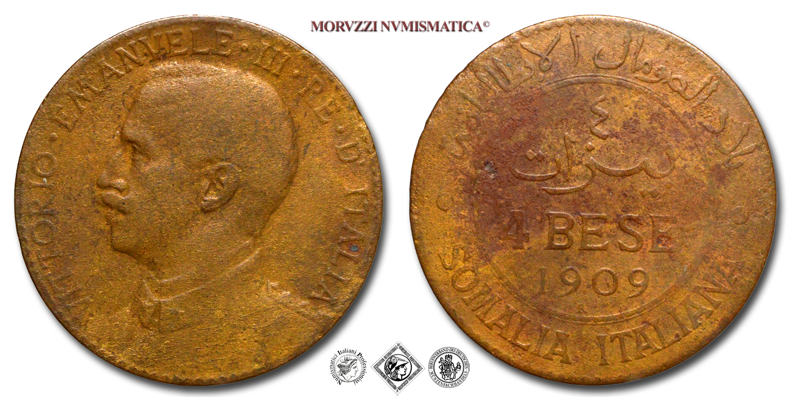 Regno d'Italia, Somalia Italiana, VITTORIO EMANUELE III, 1909-1925, BESE 4, Emissione: 1909, D/ Semibusto del Re in uniforme visto di fronte ma volto a sinistra. Lungo il bordo la scritta VITTORIO • EMANVELE • III • RE • D'ITALIA • e ad ore 5 il nome dell'autore in incuso (L • GIORGI), R/ Nel campo indicazione del valore (4 BESE) e del millesimo (1909) sia in italiano che in arabo all'interno di un cerchio. Intorno SOMALIA ITALIANA nella parte inferiore e in arabo nella parte superiore; le due scritte sono separate da due rosette. Sotto la data in caratteri latini, il segno di zecca (R •), Zecca di Roma, Rif. bibl. Pagani, 973; Metallo: CU, gr. 9,03, (MI160033), Diam.: mm. 29,84, qBB, (R)