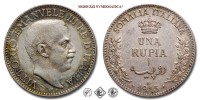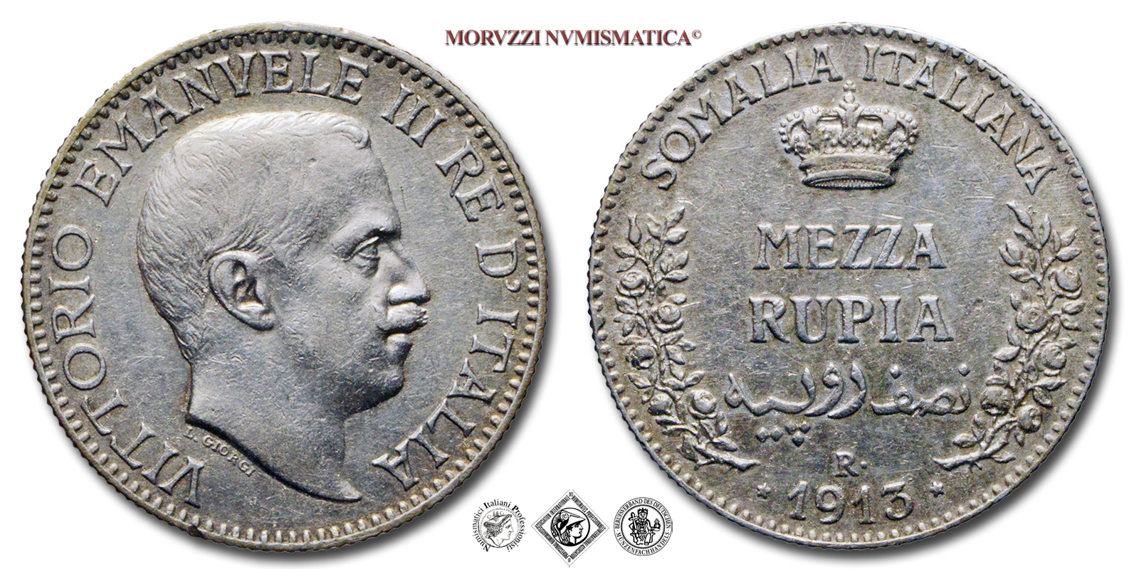 Somalia italiana, VITTORIO EMANUELE III, 1909-1925, RUPIA 1/2, Emissione: 1913, D/ Testa nuda del Re volta a destra, sotto il collo indicazione dell'autore (L. GIORGI). Lungo il bordo la scritta VITTORIO EMANVELE III RE D'ITALIA, R/ Nel campo indicazione del valore (MEZZA RUPIA) sia in italiano (su due righe sormontata da una corona) che in arabo, sotto, il millesimo (* 1913 *) con due stelle a cinque punte ai lati. Sotto al millesimo si trova il segno di zecca (R •). Lungo il bordo nella parte superiore SOMALIA ITALIANA, nella parte mediana tralci di rose, Zecca di Roma, Rif. bibl. Pagani, 968; Metallo: AR, gr. 5,79, (MI161546), Diam.: mm. 24,35, SPL, (R)
