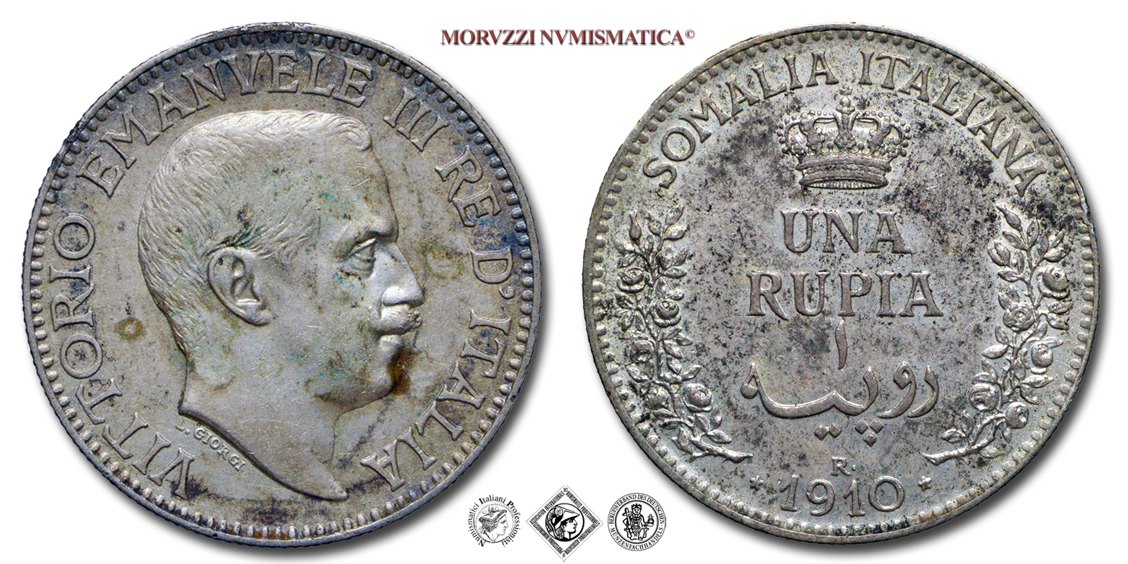 Somalia italiana, VITTORIO EMANUELE III, 1909-1925, RUPIA, Emissione: 1910, D/ Testa nuda del Re volta a destra, sotto il collo indicazione dell'autore (L. GIORGI). Lungo il bordo la scritta VITTORIO EMANVELE III RE D'ITALIA, R/ Nel campo indicazione del valore (UNA RUPIA) sia in italiano (su due righe sormontata da una corona) che in arabo, sotto, il millesimo (* 1910 *) con due stelle a cinque punte ai lati. Sotto al millesimo si trova il segno di zecca (R •). Lungo il bordo nella parte superiore SOMALIA ITALIANA, nella parte mediana tralci di rose, Zecca di Roma, Rif. bibl. Pagani, 958; Metallo: AR, gr. 11,71, (MI160024), Diam.: mm. 30,27, qSPL, (R)