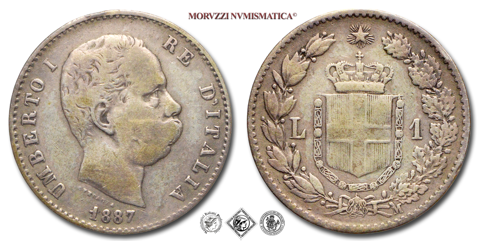 Regno d'Italia, UMBERTO I, 1878-1900, LIRA, Emissione: 1887 M, D/ UMBERTO I RE D'ITALIA, testa nuda del Re a d.; sotto al collo del Re: indicazione dell'autore (SPERANZA); in basso: il millesimo (1887), R/ Stemma crociato sabaudo sormontato da corona reale con collare dell'Annunziata circondato da due rami di alloro (a sinistra) e di quercia (a destra). Ai lati dello stemma indicazione del valore (L. 1), a ore 5 lungo il bordo segno di zecca (M). Sopra la corona Stella d'Italia, Zecca di Milano, Rif. bibl. Pagani, 604; Metallo: AR, gr. 4,87, (MI102604), Diam.: mm. 23,32, MB