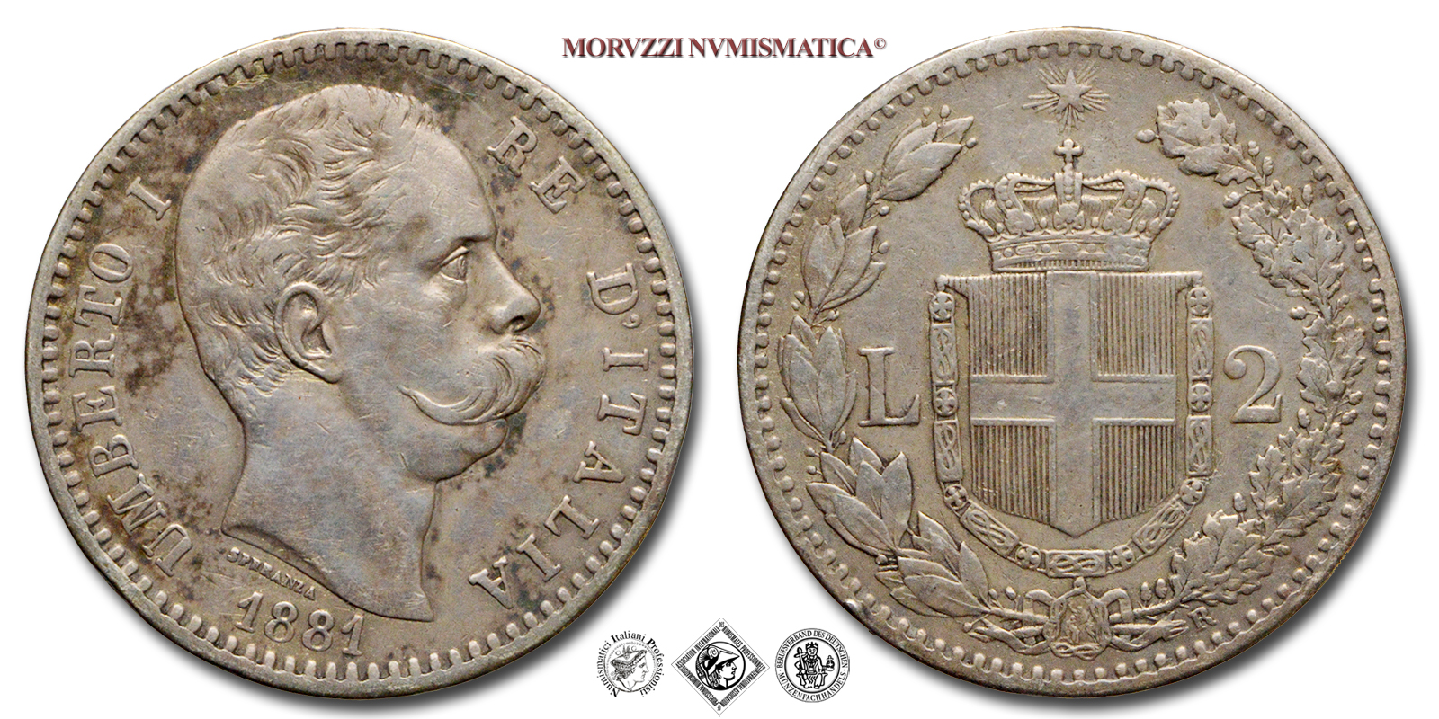 Regno d'Italia, UMBERTO I, 1878-1900, LIRE 2, 1° tipo, Emissione: 1881, D/ testa nuda del Re volta a destra contornata dalla scritta UMBERTO I RE D'ITALIA e la data (1881). Sotto al collo del Re il nome dell'autore: SPERANZA, R/ stemma Sabaudo contornato da rami di alloro e dal valore (L • 2). In basso a ore cinque il segno di zecca (R). In alto la stella d'Italia, Zecca di Roma, Rif. bibl. Pagani, 591; Metallo: AR, gr. 9,91, (MI131249), Diam.: mm. 27,01, BB