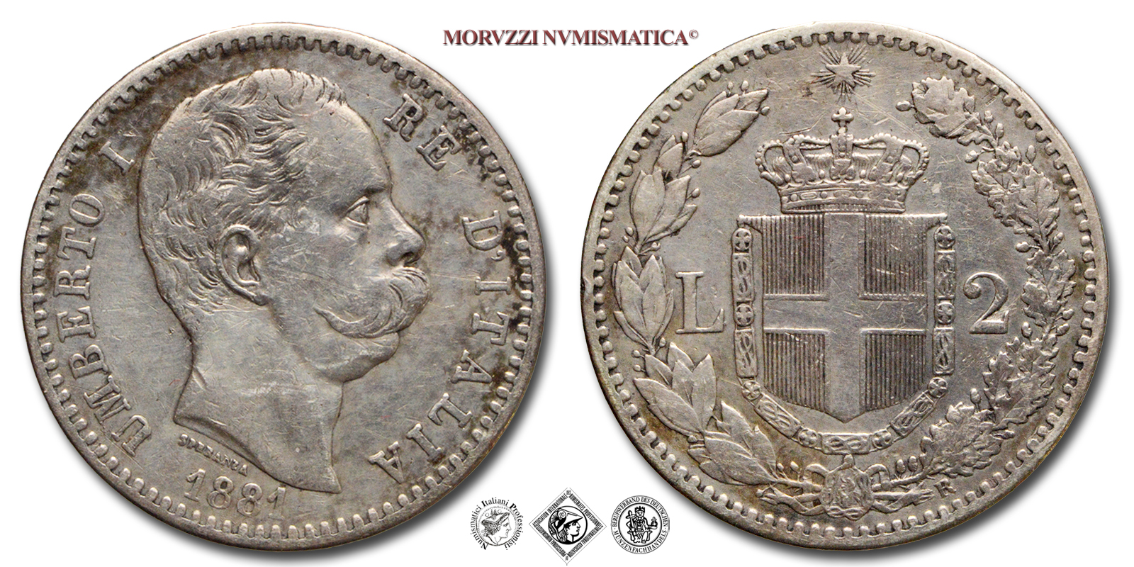 Regno d'Italia, UMBERTO I, 1878-1900, LIRE 2, 1° tipo, Emissione: 1881, D/ testa nuda del Re volta a destra contornata dalla scritta UMBERTO I RE D'ITALIA e la data (1881). Sotto al collo del Re il nome dell'autore: SPERANZA, R/ stemma Sabaudo contornato da rami di alloro e dal valore (L • 2). In basso a ore cinque il segno di zecca (R). In alto la stella d'Italia, Zecca di Roma, Rif. bibl. Pagani, 591; Metallo: AR, gr. 9,84, (MI131250), Diam.: mm. 27,01, BB