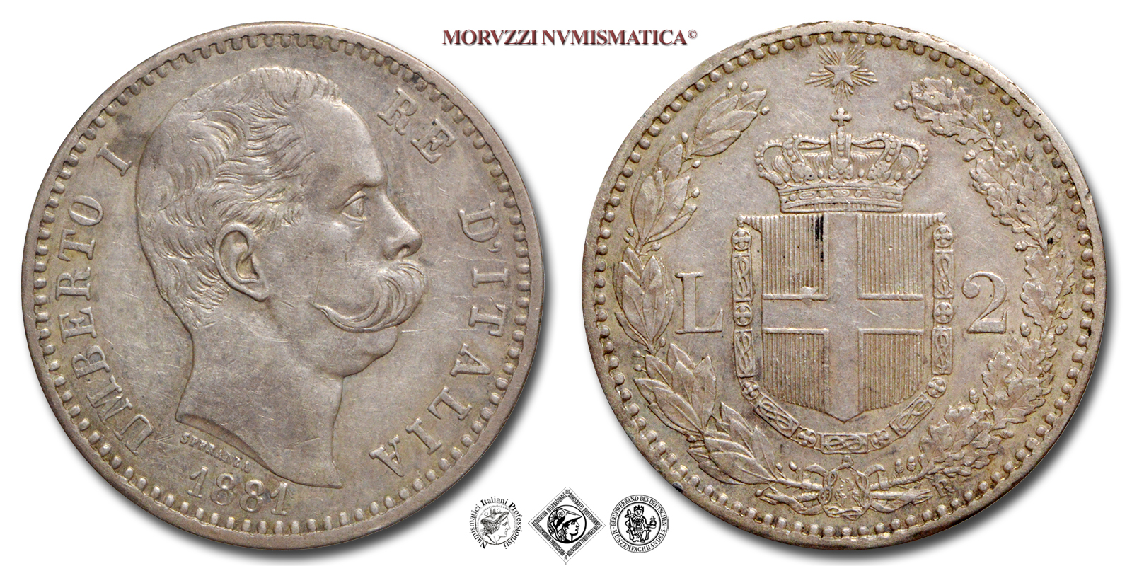 Regno d'Italia, UMBERTO I, 1878-1900, LIRE 2, Emissione: 1881, D/ testa nuda del Re volta a destra contornata dalla scritta UMBERTO I RE D'ITALIA e la data (1881). Sotto al collo del Re il nome dell'autore: SPERANZA, R/ stemma Sabaudo contornato da rami di alloro e dal valore (L • 2). In basso a ore cinque il segno di zecca (R). In alto la stella d'Italia, Zecca di Roma, Rif. bibl. Pagani, 591; Metallo: AR, gr. 10,02, (MI150343), Diam.: mm. 27,05, SPL
