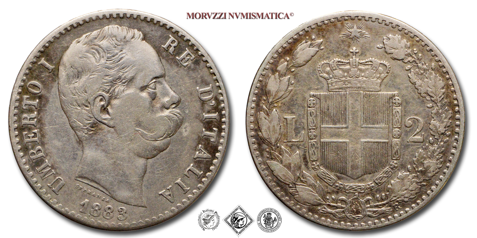Regno d'Italia, UMBERTO I, 1878-1900, LIRE 2, Emissione: 1883, D/ UMBERTO I RE D'ITALIA, testa nuda del Re a d.; sotto al collo del Re il nome dell'autore (SPERANZA); in basso: il millesimo (1883), R/ Stemma Sabaudo contornato da rami di alloro e dal valore (L • 2). In basso a ore 5 il segno di zecca (R). In alto la stella d'Italia, Zecca di Roma, Rif. bibl. Pagani, 593; Metallo: AR, gr. 9,92, (MI131248), Diam.: mm. 27,07, qBB