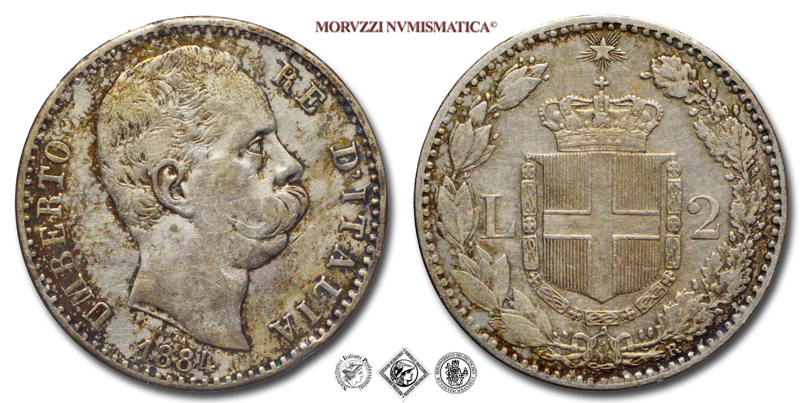 Regno d'Italia, UMBERTO I, 1878-1900, LIRE 2, Emissione: 1884, D/ UMBERTO I RE D'ITALIA, testa nuda del Re a d.; sotto al collo del Re il nome dell'autore (SPERANZA); in basso il millesimo (1884), R/ stemma Sabaudo contornato da rami di alloro e dal valore (L 2); in basso, a ore cinque, il segno di zecca (R); in alto la Stella d'Italia, Zecca di Roma, Rif. bibl. Pagani, 594; Metallo: AR, gr. 9,89, (MI153001), Diam.: mm. 27,02, BB