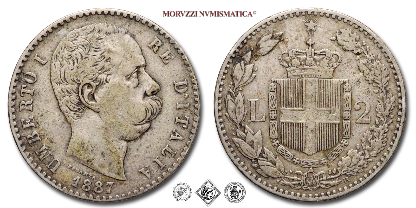 Regno d'Italia, UMBERTO I, 1878-1900, LIRE 2, Emissione: 1887, D/ UMBERTO I RE D'ITALIA, testa nuda del Re a d.; sotto al collo del Re il nome dell'autore (SPERANZA); in basso: il millesimo (1887), R/ Stemma Sabaudo contornato da rami di alloro e dal valore (L • 2). In basso a ore 5 il segno di zecca (R). In alto la stella d'Italia, Zecca di Roma, Rif. bibl. Pagani, 597; Metallo: AR, gr. 9,96, (MI107652), Diam.: mm. 27,04, BB