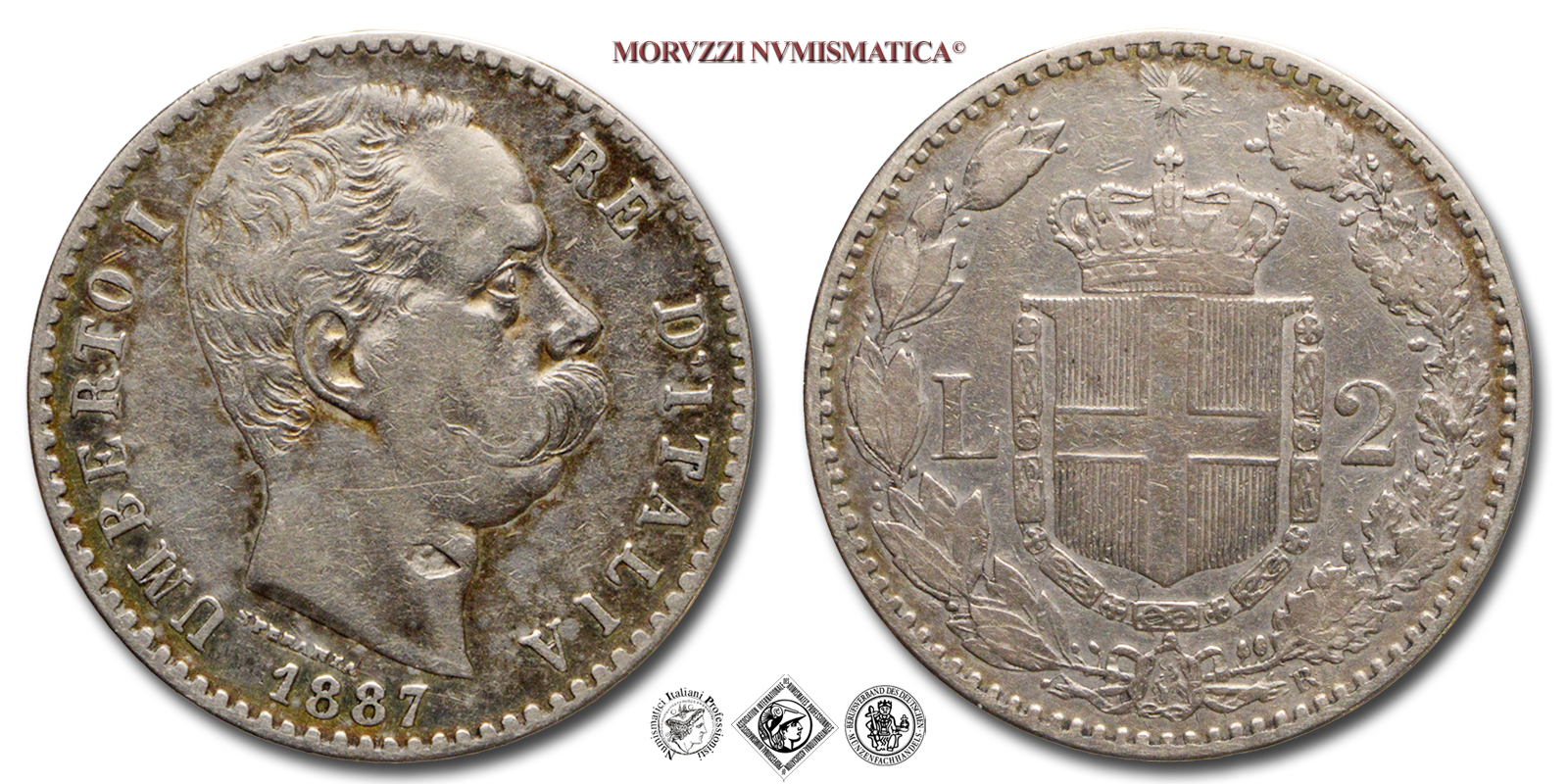 Regno d'Italia, UMBERTO I, 1878-1900, LIRE 2, 2° tipo, Emissione: 1887, D/ UMBERTO I RE D'ITALIA, testa nuda del Re a d.; sotto al collo del Re il nome dell'autore (SPERANZA); in basso: il millesimo (1887), R/ Stemma Sabaudo contornato da rami di alloro e dal valore (L • 2). In basso a ore 5 il segno di zecca (R). In alto la stella d'Italia, Zecca di Roma, Rif. bibl. Pagani, 597; Metallo: AR, gr. 9,91, (MI131253), Diam.: mm. 27,05, BB