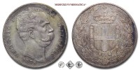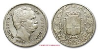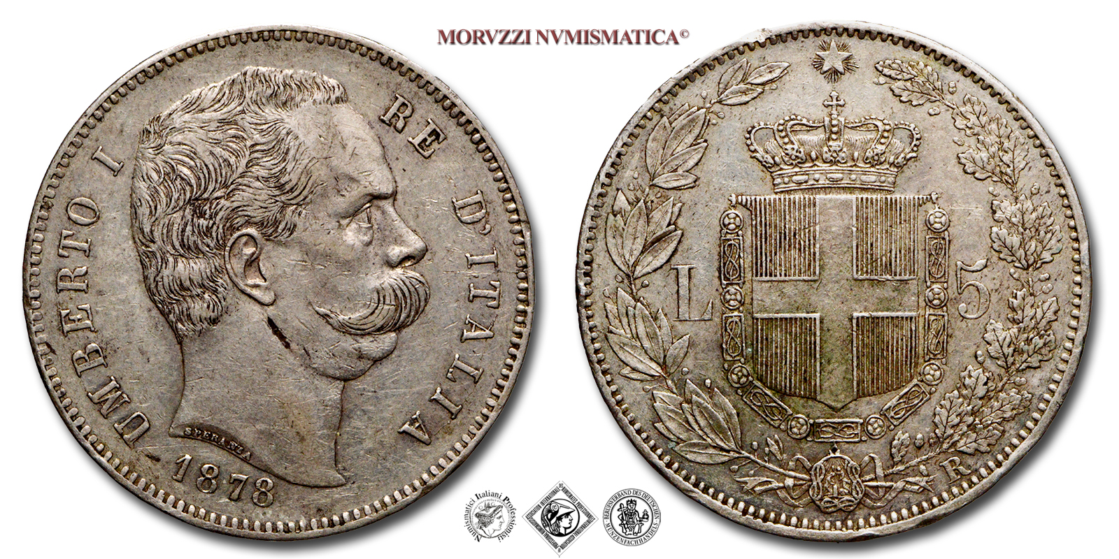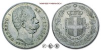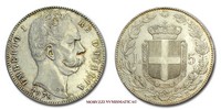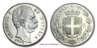 Regno d'Italia, UMBERTO I, 1878-1900, LIRE 5, Emissione: 1878, D/ UMBERTO I RE D'ITALIA, testa nuda del Re volta a destra. Nella parte inferiore del collo il nome dell'incisore: SPERANZA •; sotto: la data (1878), R/ stemma del casato Savoia con il collare dell'Annunziata sormontato da corona Reale; a destra rami di rovere e a sinistra rami di alloro. In alto la stella d'Italia, in basso a ore cinque il segno di zecca (R), Zecca di Roma, Rif. bibl. Pagani, 589; Metallo: AR, gr. 25,01, (MI67991), Diam.: mm. 37,13, qSPL, (RR)