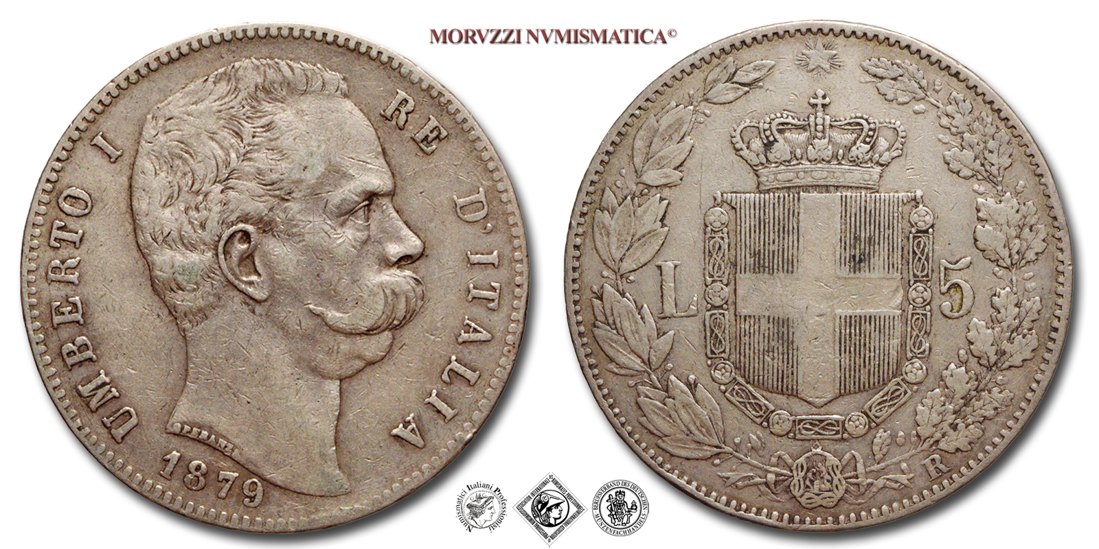 Regno d'Italia, UMBERTO I, 1878-1900, LIRE 5, Emissione: 1879, D/ UMBERTO I RE D'ITALIA, testa nuda del Re volta a destra. Nella parte inferiore del collo il nome dell'incisore: SPERANZA •, R/ stemma del casato Savoia con il collare dell'Annunziata sormontato da corona Reale; a destra rami di rovere e a sinistra rami di alloro. In alto la stella d'Italia, in basso a ore cinque il segno di zecca (R), Zecca di Roma, Rif. bibl. Pagani, 590; Metallo: AR, gr. 24,85, (MI161942), Diam.: mm. 37,09, BB