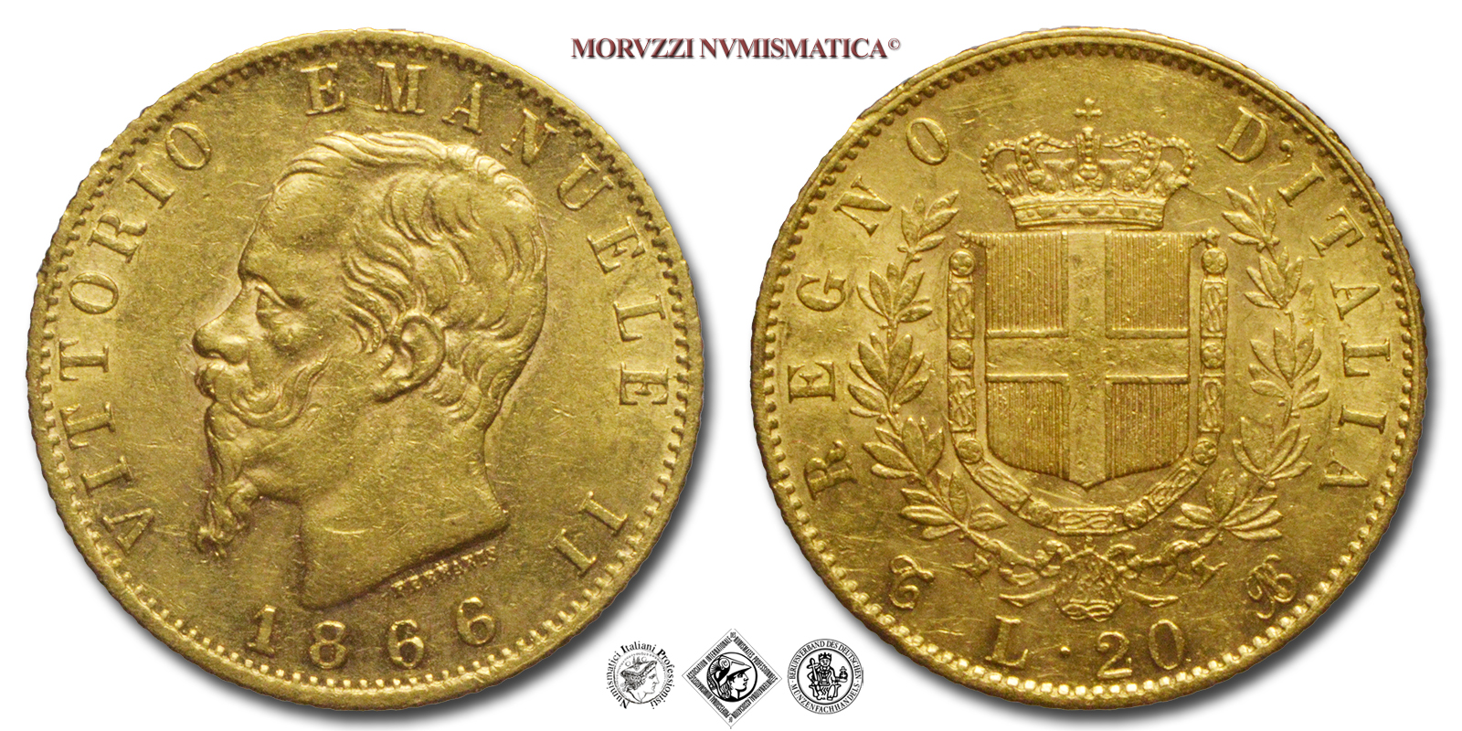 Regno d'Italia, VITTORIO EMANUELE II, 1861-1878, LIRE 20, Emissione: 1866 T, D/ VITTORIO EMANUELE II e millesimo (1866) in basso, testa nuda del Re a s.; sotto il collo: indicazione dell'autore (FERRARIS), R/ stemma Sabaudo contornato dal collare dell'Annunziata tra rami di alloro; intorno: REGNO D'ITALIA; in basso: valore (L. 20) e segno di zecca (T e monogramma BN in corsivo), Zecca di Torino, Rif. bibl. Pagani, 460; Metallo: AU, gr. 6,46, (MI161449), Diam.: mm. 21,19, qSPL, (R)