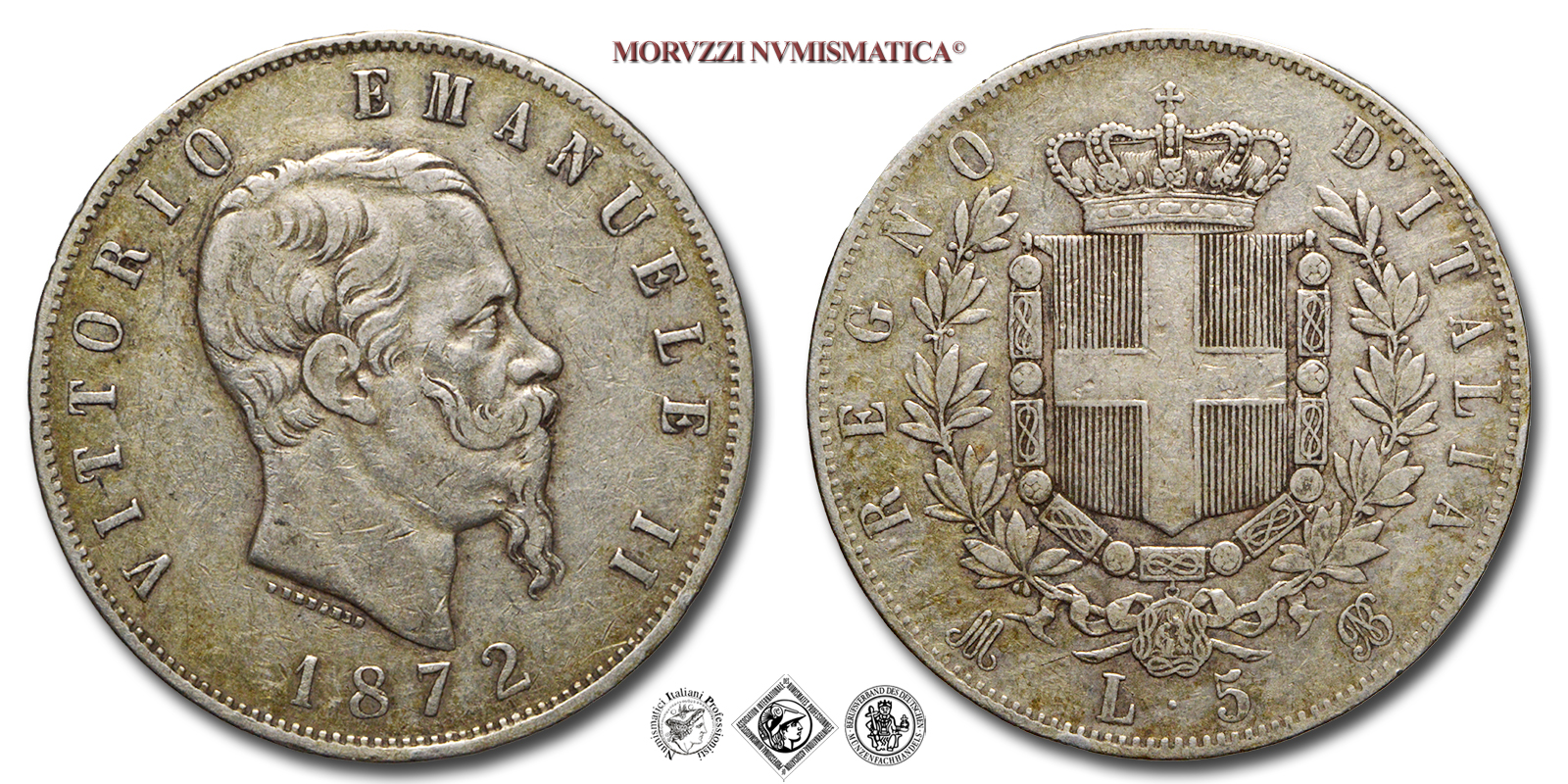 Regno d'Italia, VITTORIO EMANUELE II, 1861-1878, LIRE 5, Emissione: 1872 M, D/ VITTORIO EMANUELE II, testa nuda del Re a d.; lungo il taglio del collo il nome dell'incisore FERRARIS; sotto il millesimo (1872), R/ Stemma del casato Savoia con il collare dell'Annunziata sormontato da corona Reale e circondato da due rami di lauro; sotto: il segno di zecca (M), il valore nominale (L • 5) e il monogramma (BN), Zecca di Milano, Rif. bibl. Pagani, 494; Metallo: AR, gr. 24,89, (MI162122), Diam.: mm. 37,06, BB