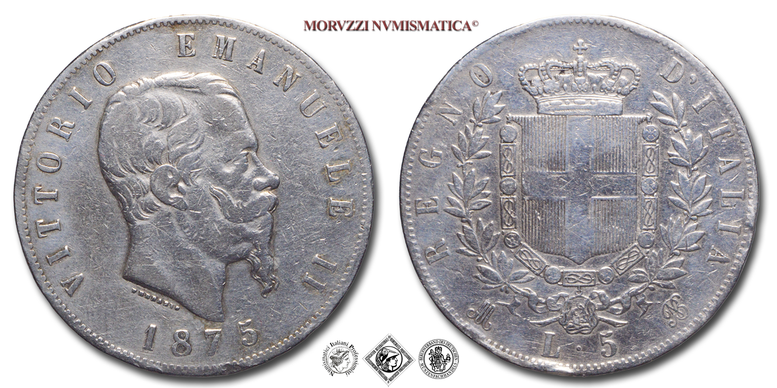 Regno d'Italia, VITTORIO EMANUELE II, 1861-1878, LIRE 5, Emissione: 1875 M, D/ VITTORIO EMANUELE II, testa nuda del Re a d.; lungo il taglio del collo il nome dell'incisore FERRARIS; sotto il millesimo (1875), R/ Stemma del casato Savoia con il collare dell'Annunziata sormontato da corona Reale e circondato da due rami di lauro; sotto: il segno di zecca (M), il valore nominale (L • 5) e il monogramma (BN), Zecca di Milano, Rif. bibl. Pagani, 499; Metallo: AR, gr. 24,99, (MI160893), Diam.: mm. 37,02, MB
