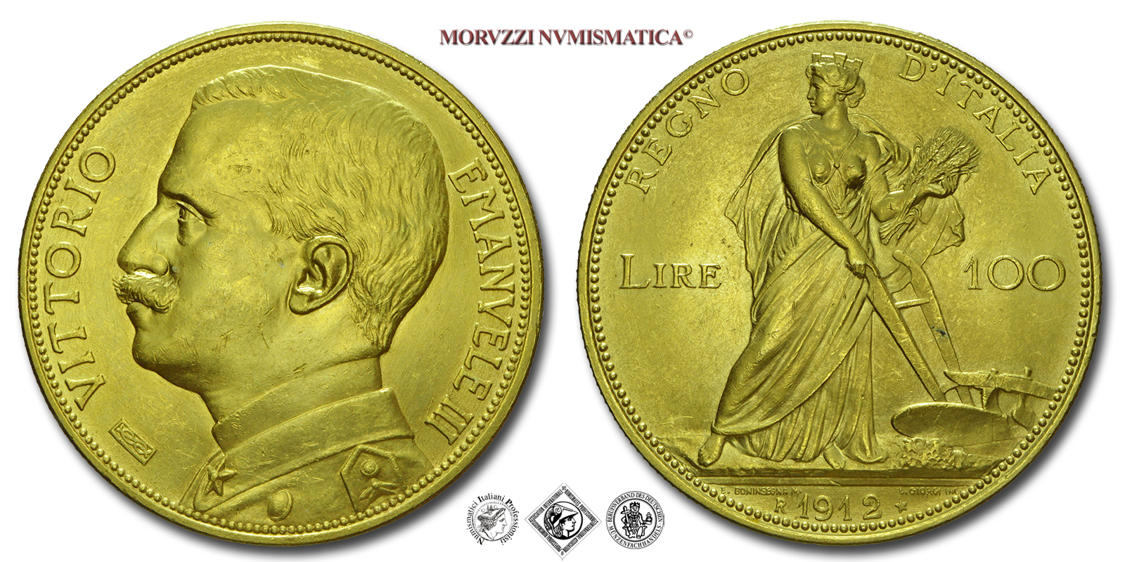 Emissione: 1912, Zecca di Roma, Rif. bibl. Pagani, 641; Metallo: AU, gr. 32,30, (MI10902), Diam.: mm. 35,01, qFDC, (R)