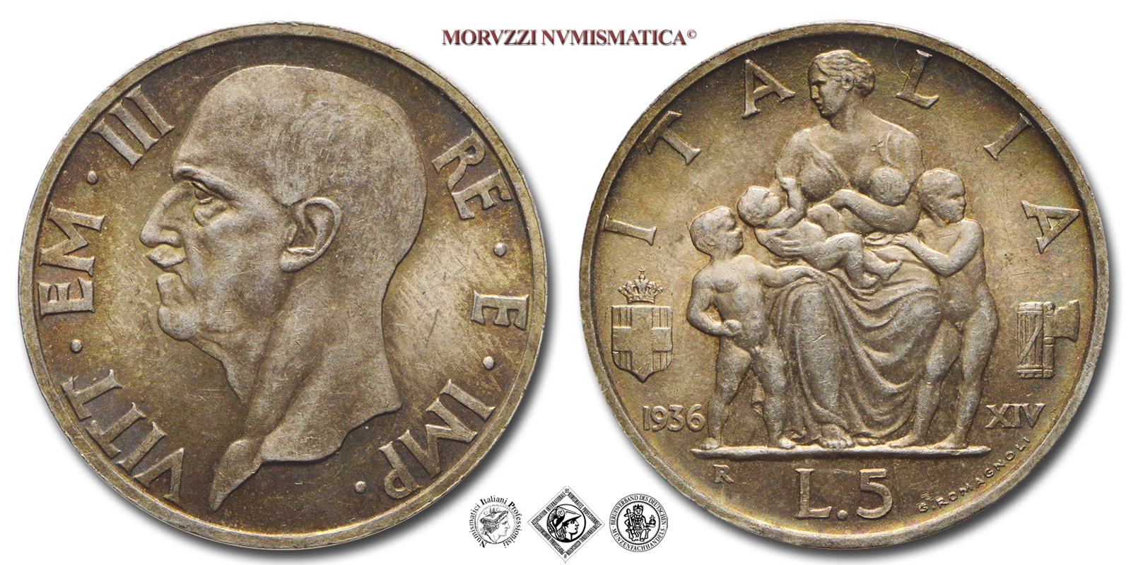 Regno d'Italia, VITTORIO EMANUELE III, 1900-1943, 5 LIRE, Fecondità (Famiglia), Emissione: 1936 XIV, D/ VITT • EM • III RE • E • IMP •, testa nuda del Re a s., R/ ITALIA, allegoria della fecondità: figura muliebre attorniata da bambini; a ore otto stemma sabaudo con sotto la data (1936); a ore tre fascio littorio e anno dell'era fascista (XIV); in esergo: il valore (L • 5) con ai lati il segno di zecca (R) e il nome dell'autore (G • ROMAGNOLI), Zecca di Roma, Rif. bibl. Pagani, 719; Metallo: AR, gr. 5,00, (MI156832), Diam.: mm. 23,10, FDC