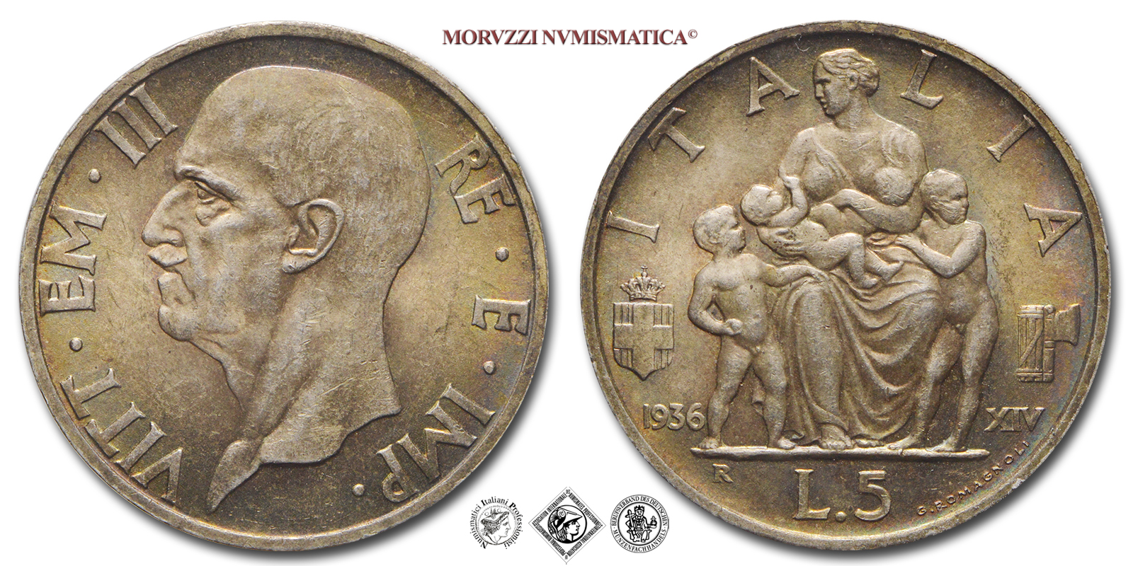 Regno d'Italia, VITTORIO EMANUELE III, 1900-1943, 5 LIRE, Fecondità (Famiglia), Emissione: 1936 XIV, D/ VITT • EM • III RE • E • IMP •, testa nuda del Re a s., R/ ITALIA, allegoria della fecondità: figura muliebre attorniata da bambini; a ore otto stemma sabaudo con sotto la data (1936); a ore tre fascio littorio e anno dell'era fascista (XIV); in esergo: il valore (L • 5) con ai lati il segno di zecca (R) e il nome dell'autore (G • ROMAGNOLI), Zecca di Roma, Rif. bibl. Pagani, 719; Metallo: AR, gr. 5,00, (MI156831), Diam.: mm. 23,08, FDC