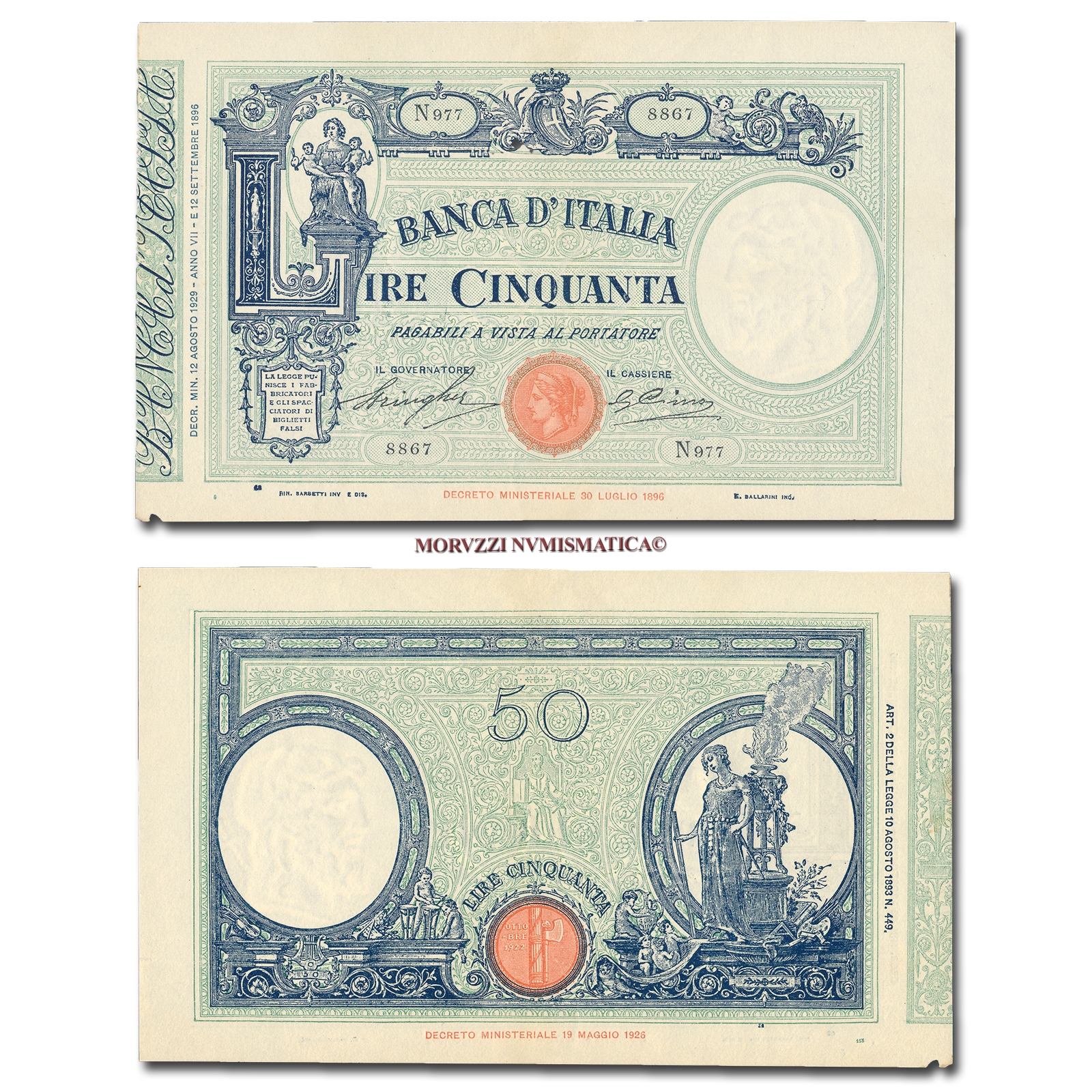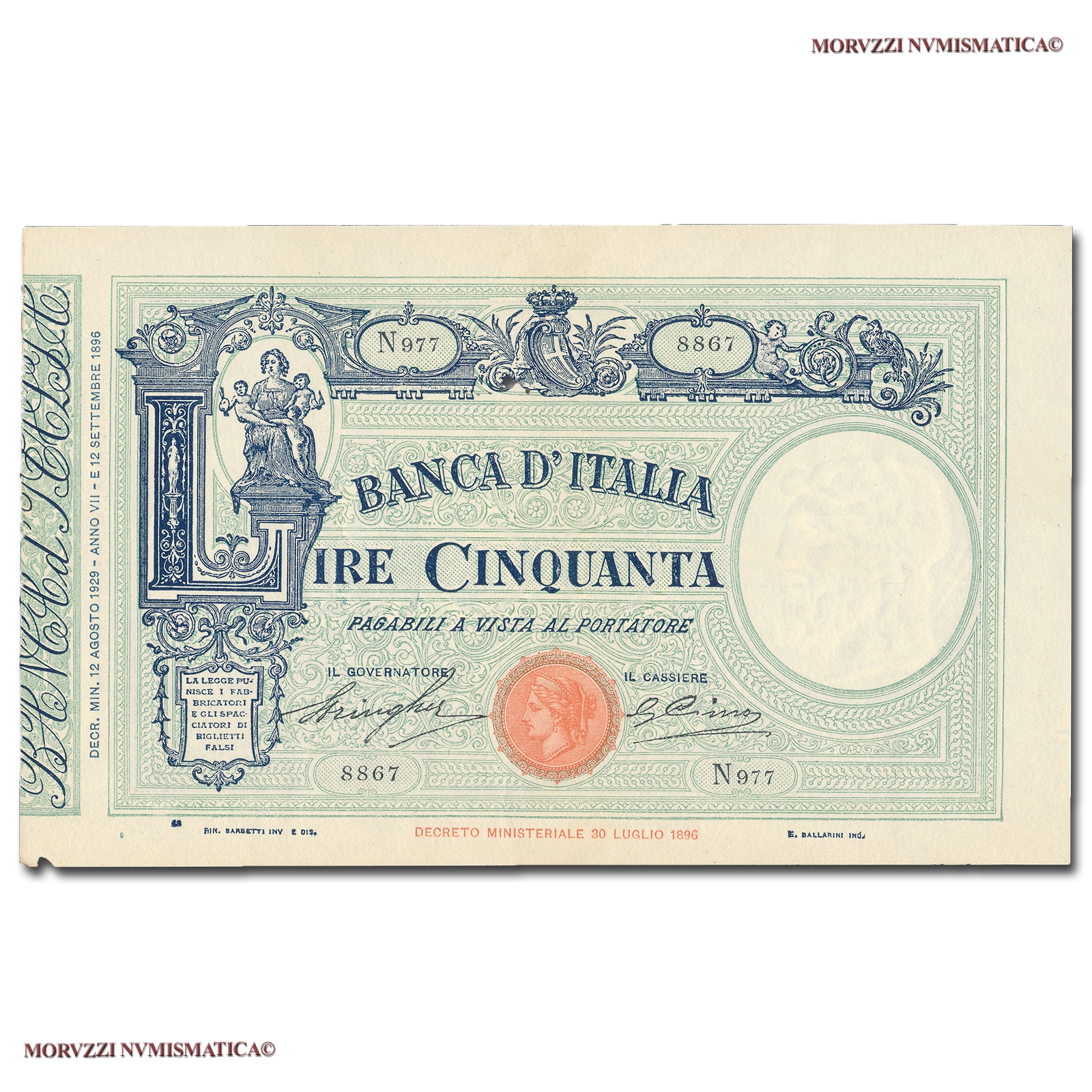 Barbetti - contrassegno: fascio, Rif. bibl. Crapanzano, 82; (CM10714), Firme: Stringher, Cima, n° di serie: N 977 8867, qFDS