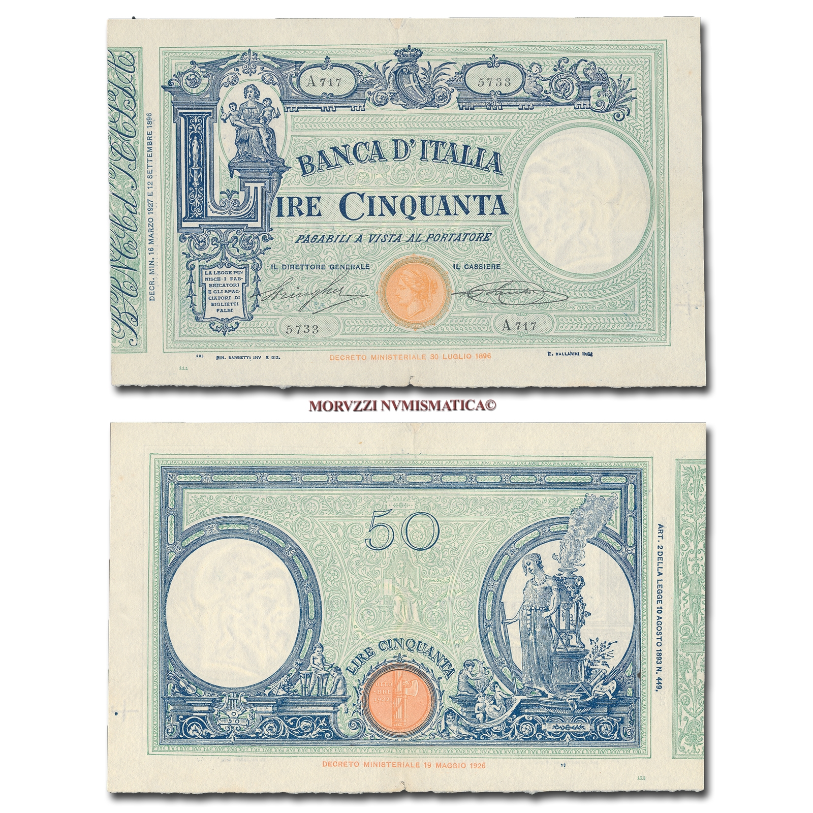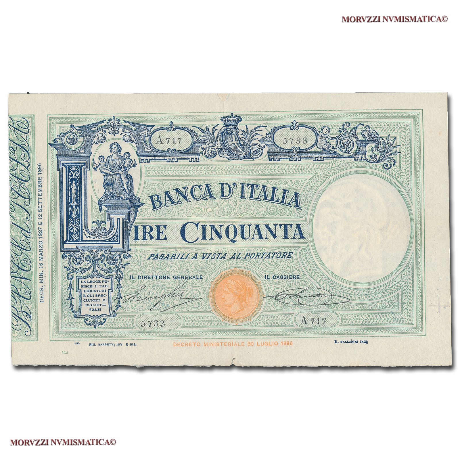 Barbetti - contrassegno: fascio, Rif. bibl. Crapanzano, 76; (CM10729), Firme: Stringher, Sacchi, n° di serie: A 717 5733, mBB