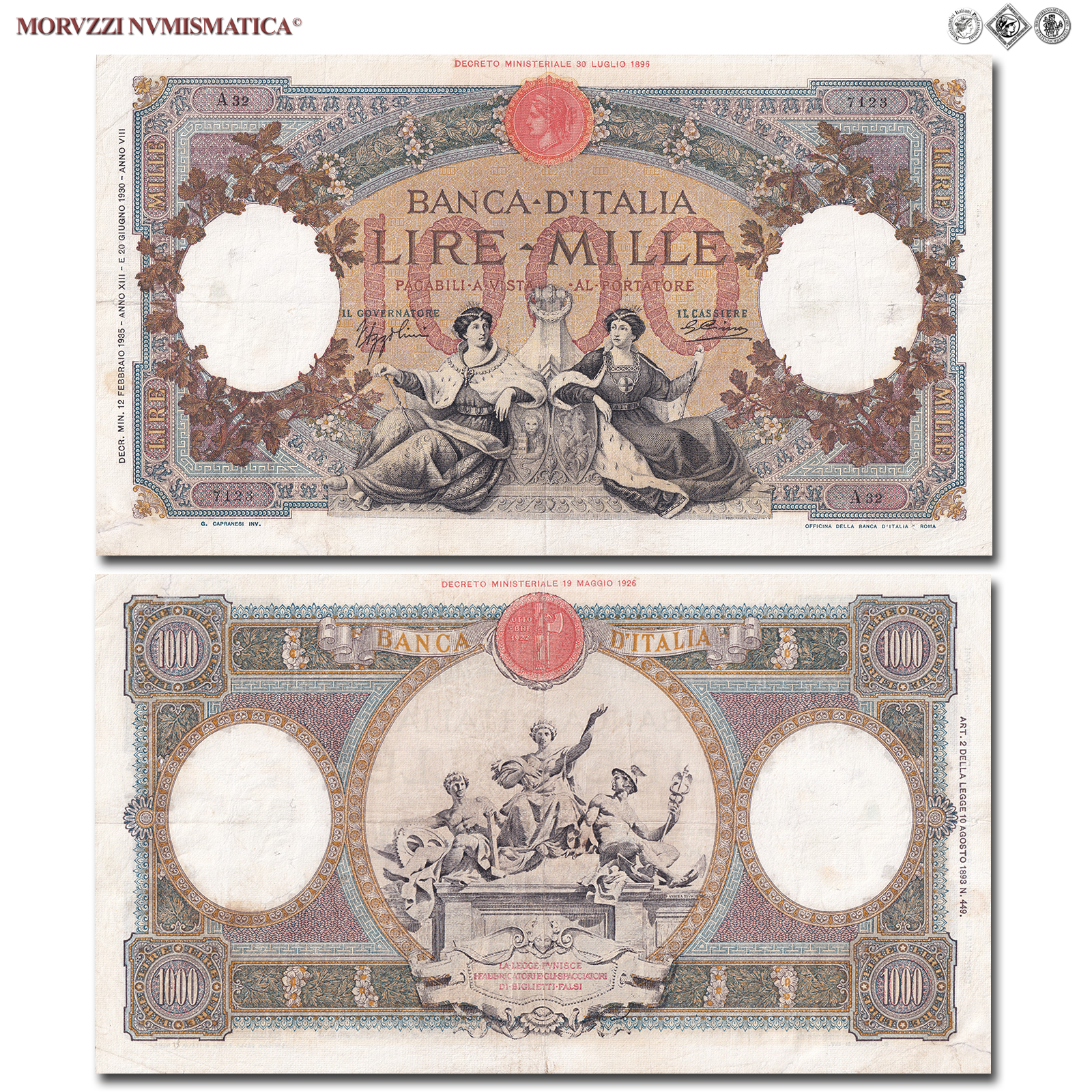 Italia, Vittorio Emanule III, BANCA D'ITALIA, LIRE 1000, Capranesi - Repubbliche Marinare (Fascio), 12.02.1935, D/ Nel centro due maestose figure femminili sedute, impugnanti il bastone del comando e poggianti sugli stemmi delle città marinare che rappresentano: Venezia e Genova; nei contorni motivi floreali, R/ Nel medaglione centrale, riproduzione del gruppo scultoreo un tempo ornante la facciata di Palazzo Kock, sede della Banca d'Italia in Roma, raffigurante le allegorie dell'Agricoltura, Industria e Commercio, Rif. bibl. Crapanzano, 387; (CM102796), Firme: Azzolini, Cima, n° di serie: A32 7123, qBB
