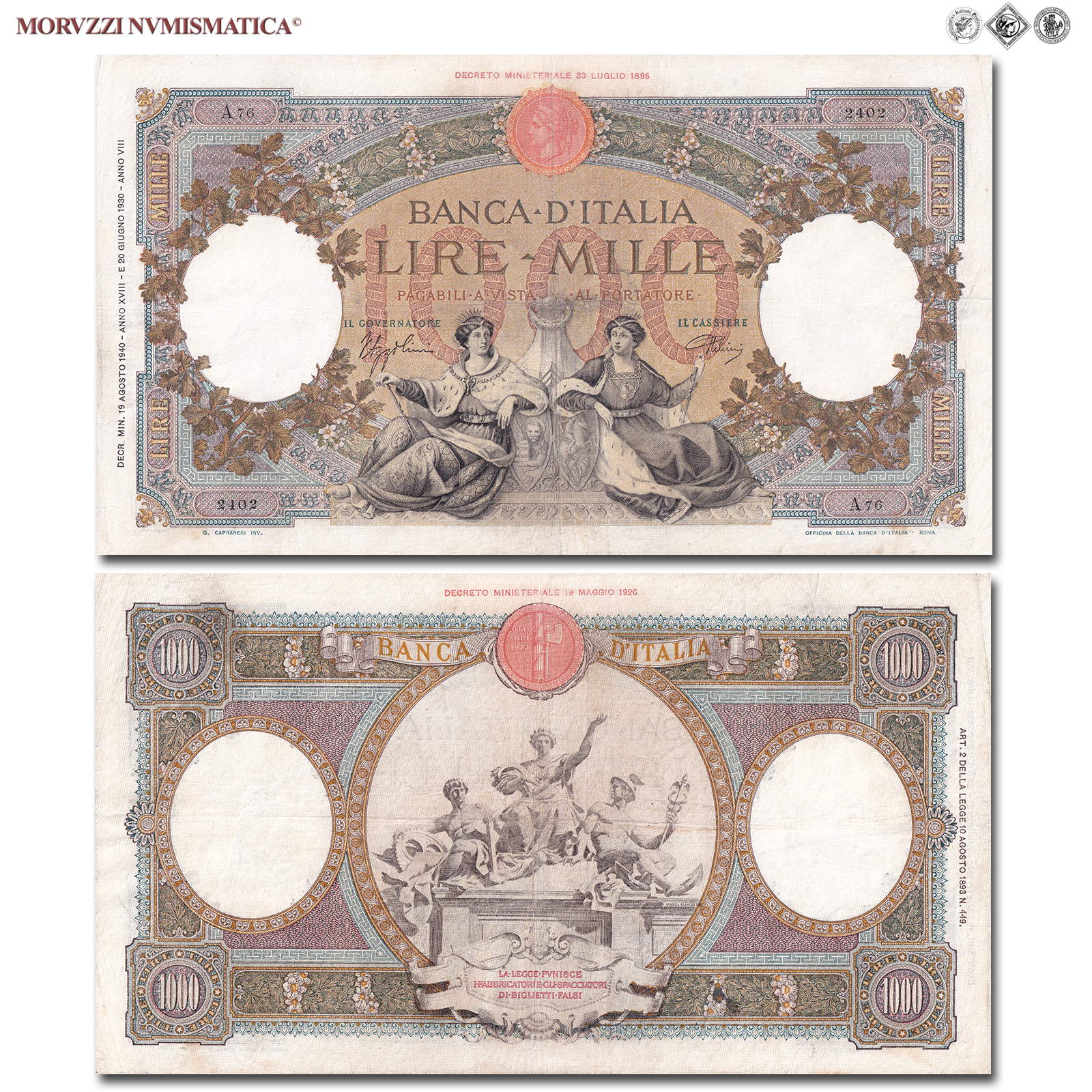 Italia, Vittorio Emanule III, BANCA D'ITALIA, LIRE 1000, Capranesi - Repubbliche Marinare (Fascio), 19.08.1940, D/ Nel centro due maestose figure femminili sedute, impugnanti il bastone del comando e poggianti sugli stemmi delle città marinare che rappresentano: Venezia e Genova; nei contorni motivi floreali, R/ Nel medaglione centrale, riproduzione del gruppo scultoreo un tempo ornante la facciata di Palazzo Kock, sede della Banca d'Italia in Roma, raffigurante le allegorie dell'Agricoltura, Industria e Commercio, Rif. bibl. Crapanzano, 395; (CM102803), Firme: Azzolini, Urbini, n° di serie: A76 2402, qBB