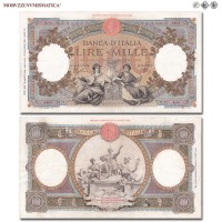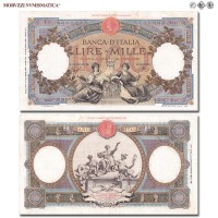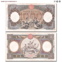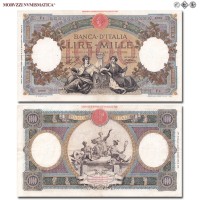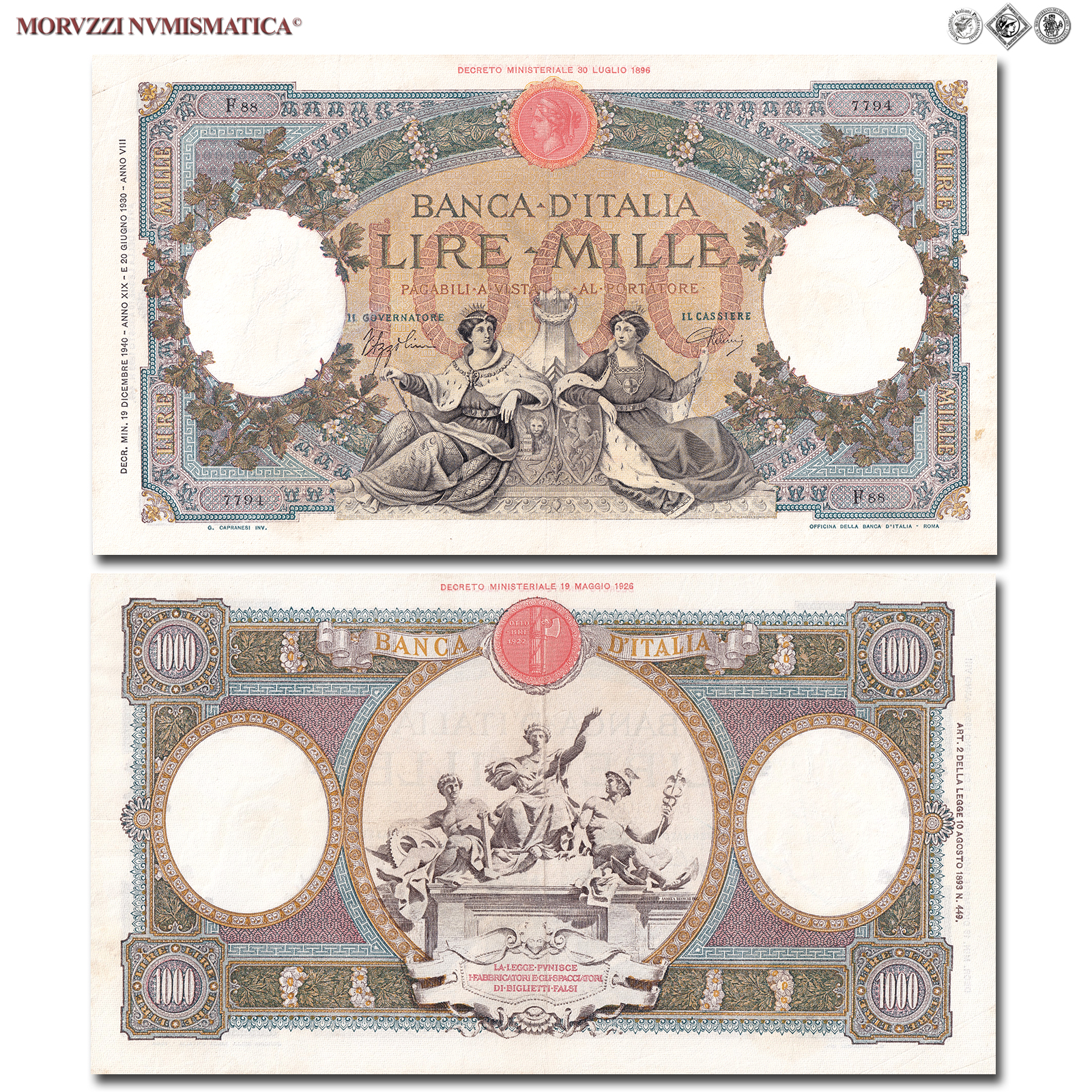 Italia, Vittorio Emanule III, BANCA D'ITALIA, LIRE 1000, Capranesi - Repubbliche Marinare (Fascio), 19.12.1940, D/ Nel centro due maestose figure femminili sedute, impugnanti il bastone del comando e poggianti sugli stemmi delle città marinare che rappresentano: Venezia e Genova; nei contorni motivi floreali, R/ Nel medaglione centrale, riproduzione del gruppo scultoreo un tempo ornante la facciata di Palazzo Kock, sede della Banca d'Italia in Roma, raffigurante le allegorie dell'Agricoltura, Industria e Commercio, Rif. bibl. Crapanzano, 396; (CM102809), Firme: Azzolini, Urbini, n° di serie: F88 7794, BB, (NC)