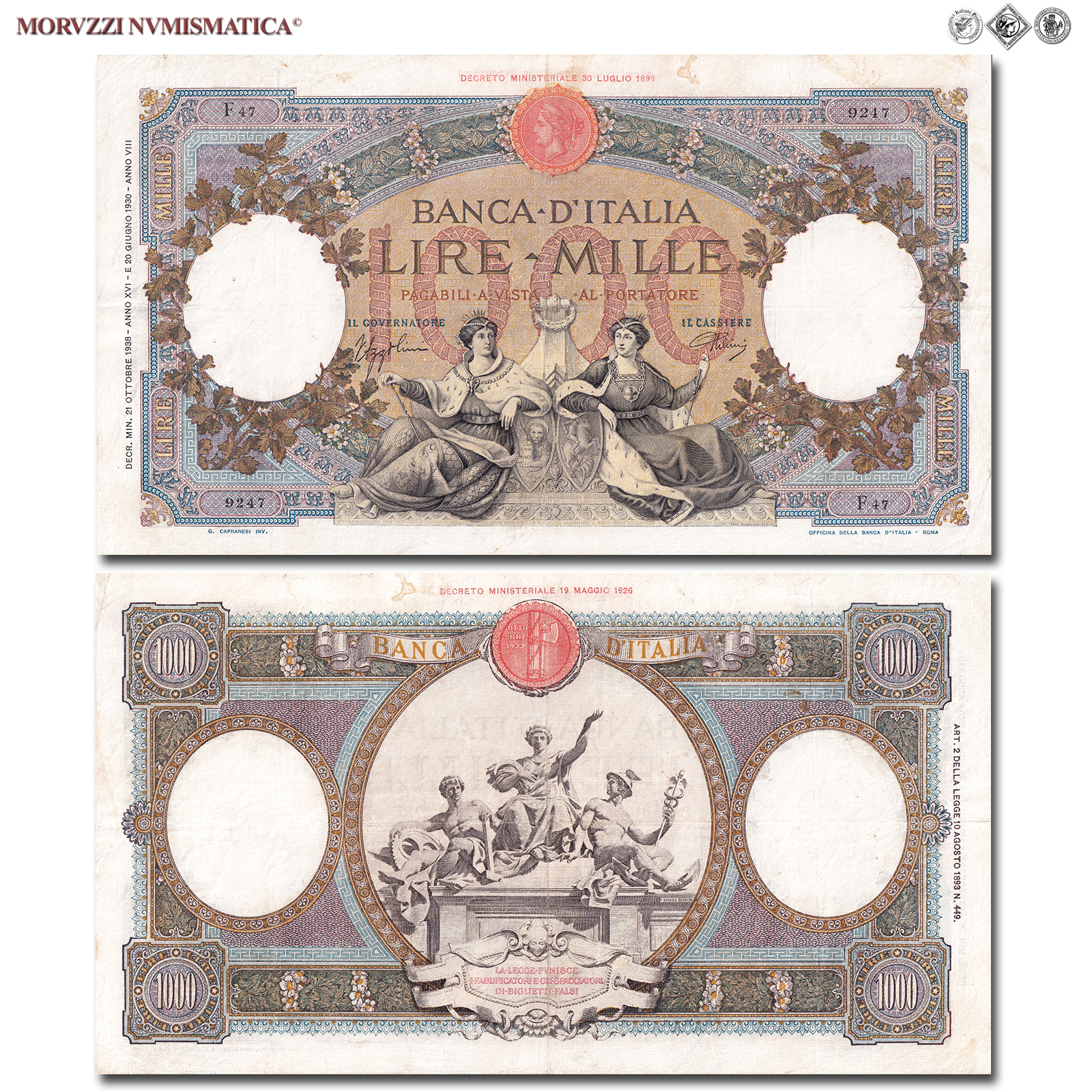 Italia, Vittorio Emanule III, BANCA D'ITALIA, LIRE 1000, Capranesi - Repubbliche Marinare (Fascio), 21.10.1938, D/ Nel centro due maestose figure femminili sedute, impugnanti il bastone del comando e poggianti sugli stemmi delle città marinare che rappresentano: Venezia e Genova; nei contorni motivi floreali, R/ Nel medaglione centrale, riproduzione del gruppo scultoreo un tempo ornante la facciata di Palazzo Kock, sede della Banca d'Italia in Roma, raffigurante le allegorie dell'Agricoltura, Industria e Commercio, Rif. bibl. Crapanzano, 390; (CM102799), Firme: Azzolini, Urbini, n° di serie: F47 9247, qBB, (NC)