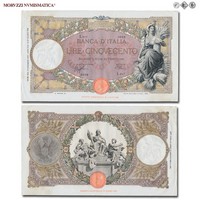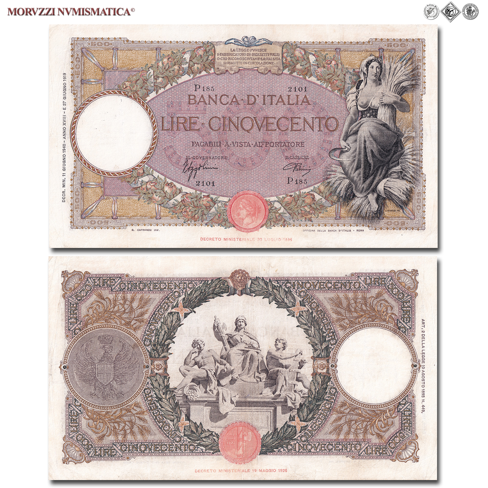 Regno d'Italia, Vittorio Emanuele III, BANCA D'ITALIA, LIRE 500, Capranesi - Mietitrice (fascio), 11.06.1940, D/ Nella destra figura muliebre, rappresentante l'Agricoltura, seduta sui covoni di grano, con falce nella mano destra e covone nella sinistra, R/ Nell'ornato centrale gruppo marmoreo esistente nella sede della Banca d'Italia, formato da figure allegoriche rappresentanti l'Economia, la Legge e la Finanza; nel medaglione sinistro aquila araldica sabauda, Rif. bibl. Crapanzano, 313; (CM102828), Firme: Azzolini, Urbini, n° di serie: P185 2101, BB