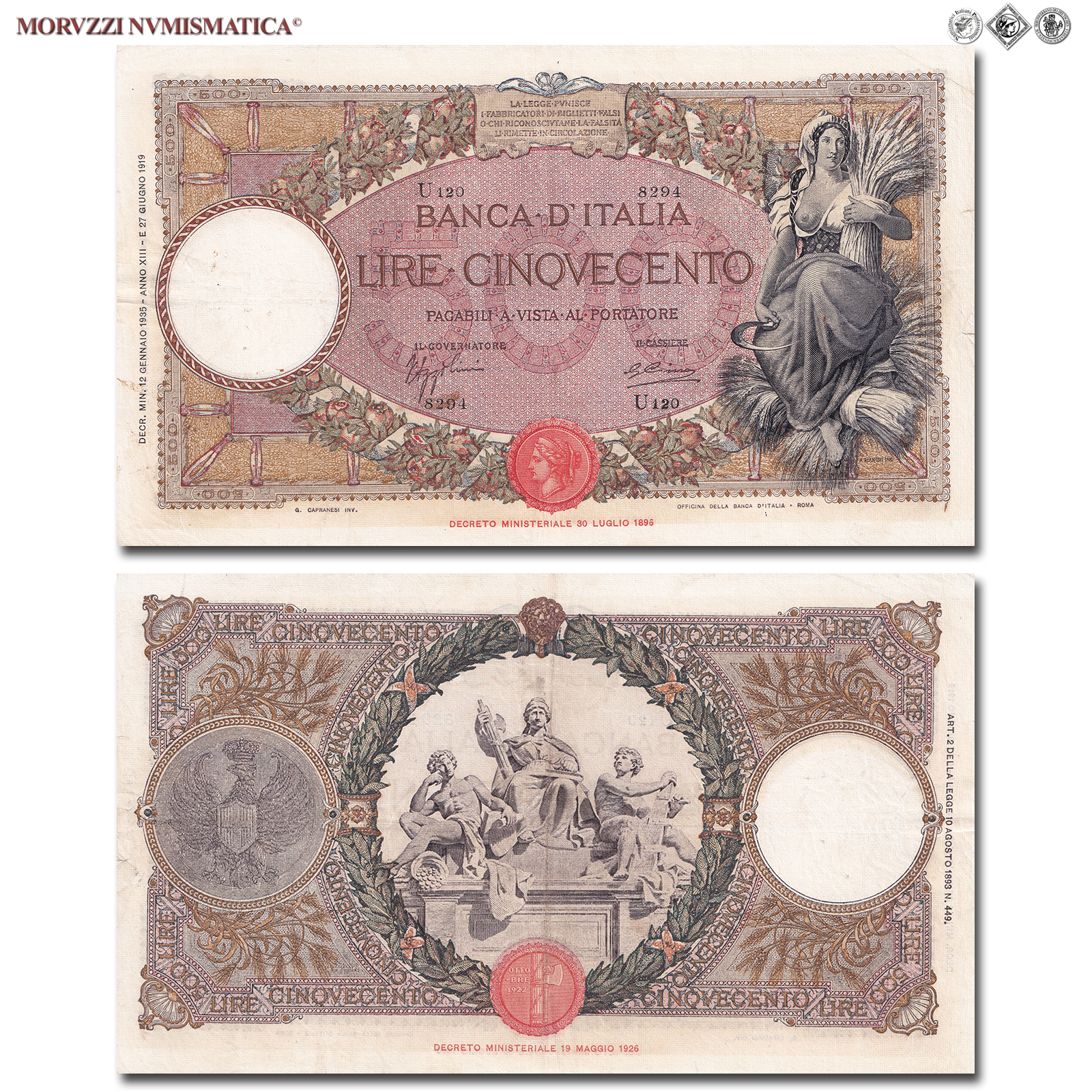 Regno d'Italia, Vittorio Emanuele III, BANCA D'ITALIA, LIRE 500, Capranesi - Mietitrice (fascio), 12.01.1935, D/ Nella destra figura muliebre, rappresentante l'Agricoltura, seduta sui covoni di grano, con falce nella mano destra e covone nella sinistra, R/ Nell'ornato centrale gruppo marmoreo esistente nella sede della Banca d'Italia, formato da figure allegoriche rappresentanti l'Economia, la Legge e la Finanza; nel medaglione sinistro aquila araldica sabauda, Rif. bibl. Crapanzano, 304; (CM102835), Firme: Azzolini, Cima, n° di serie: U120 8294, BB
