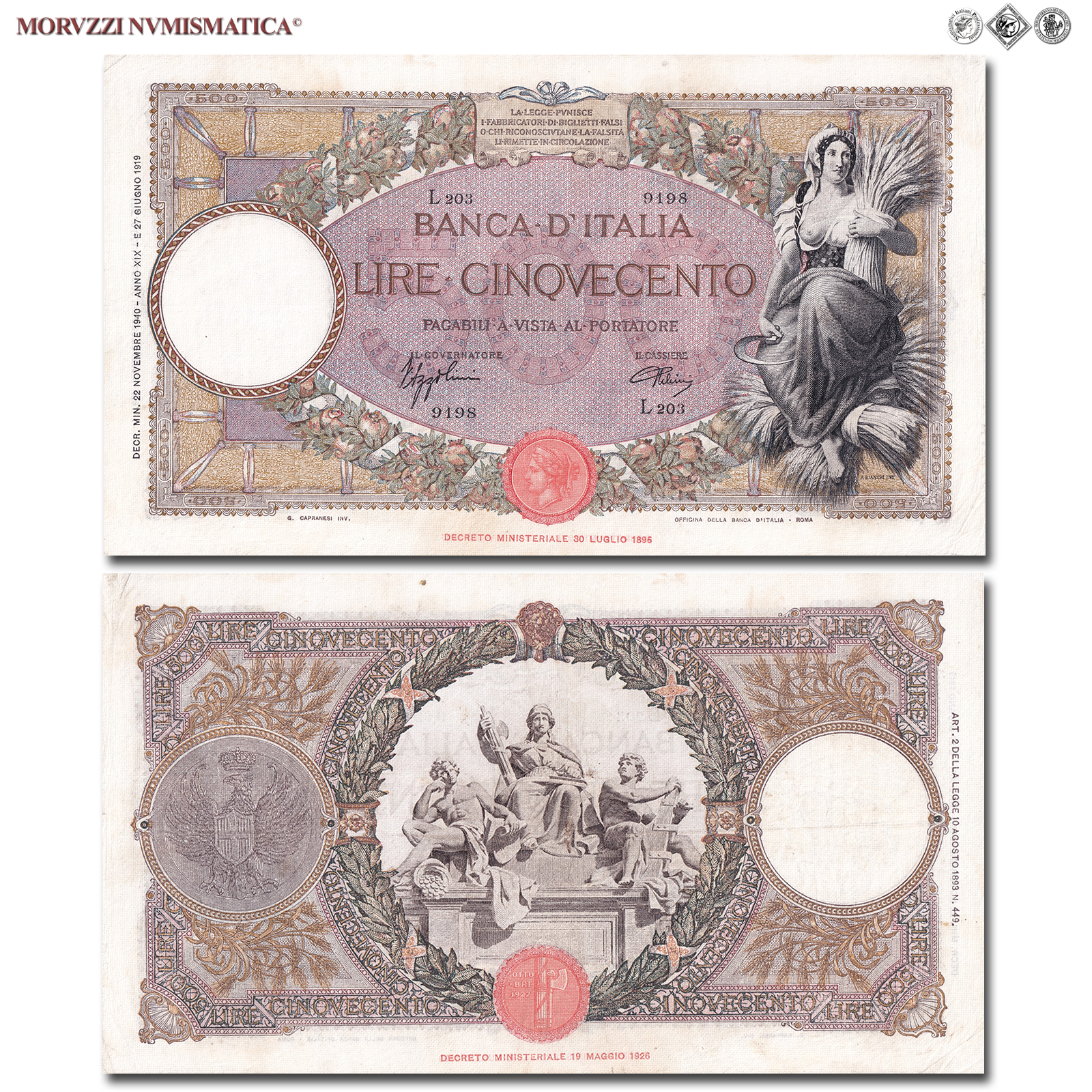 Regno d'Italia, Vittorio Emanuele III, BANCA D'ITALIA, LIRE 500, Capranesi - Mietitrice (fascio), 22.11.1940, D/ Nella destra figura muliebre, rappresentante l'Agricoltura, seduta sui covoni di grano, con falce nella mano destra e covone nella sinistra, R/ Nell'ornato centrale gruppo marmoreo esistente nella sede della Banca d'Italia, formato da figure allegoriche rappresentanti l'Economia, la Legge e la Finanza; nel medaglione sinistro aquila araldica sabauda, Rif. bibl. Crapanzano, 315; (CM102840), Firme: Azzolini, Urbini, n° di serie: L203 9198, mBB