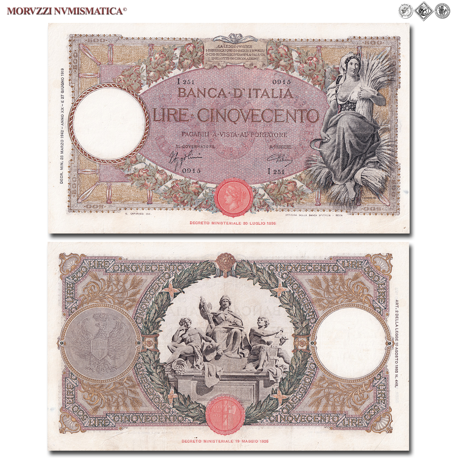 Regno d'Italia, Vittorio Emanuele III, BANCA D'ITALIA, LIRE 500, Capranesi - Mietitrice (fascio), 23.03.1942, D/ Nella destra figura muliebre, rappresentante l'Agricoltura, seduta sui covoni di grano, con falce nella mano destra e covone nella sinistra, R/ Nell'ornato centrale gruppo marmoreo esistente nella sede della Banca d'Italia, formato da figure allegoriche rappresentanti l'Economia, la Legge e la Finanza; nel medaglione sinistro aquila araldica sabauda, Rif. bibl. Crapanzano, 320; (CM102839), Firme: Azzolini, Urbini, n° di serie: I251 0915, mBB