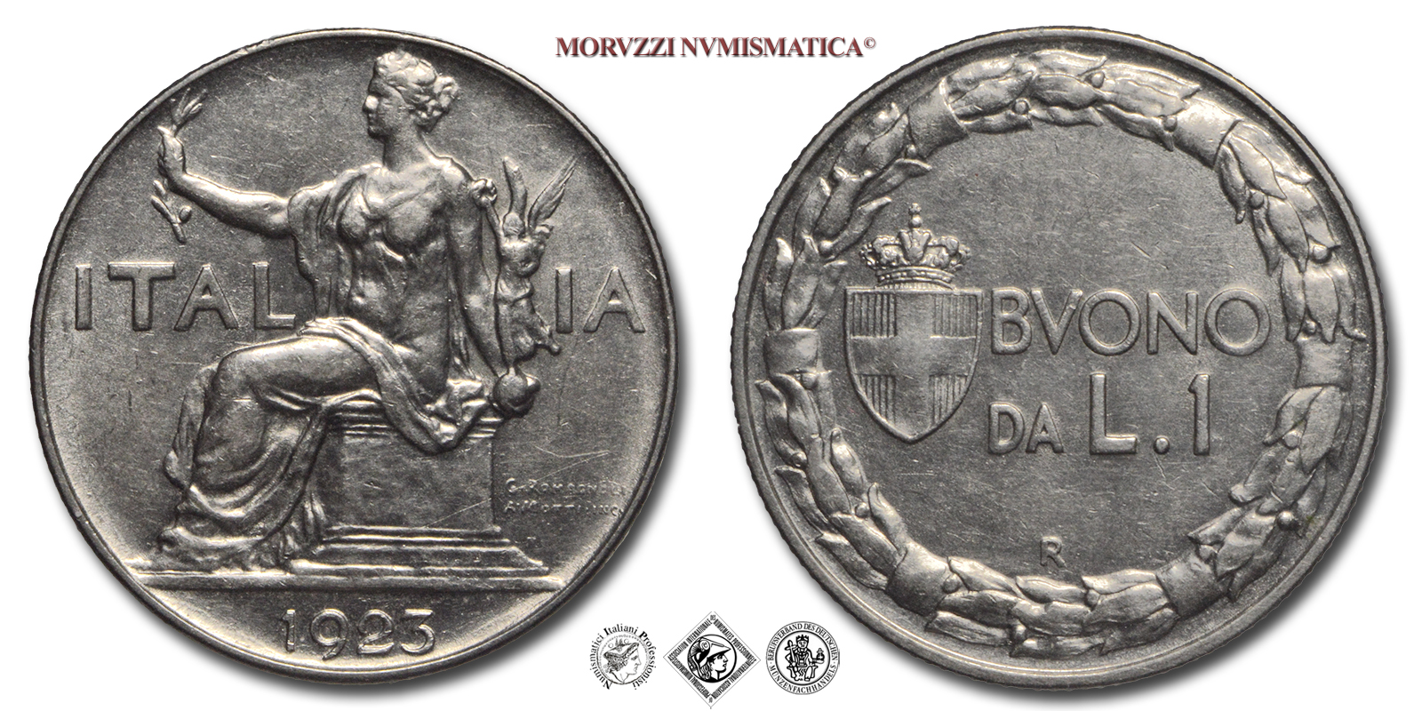 Regno d'Italia, VITTORIO EMANUELE III, 1900-1943, BUONO da 1 LIRA, Italia seduta, Emissione: 1923, D/ Figura allegorica simboleggiante l'Italia seduta su di un piedistallo e volta verso sinistra che regge con la destra un ramoscello di ulivo e con la sinistra una Vittoria alata. Sullo sfondo in orizzontale la scritta ITALIA. A destra del piedistallo i nomi degli autori G • ROMAGNOLI e A • MOTTI INC • su due righe. In esergo il millesimo (1923), R/ Indicazione del valore (BUONO DA L • 1) su due righe affiancata dallo stemma Sabaudo con corona Reale. Lungo il bordo corona di alloro posta in senso orario, Zecca di Roma, Rif. bibl. Pagani, 777; Metallo: NI, gr. 8,10, (MI126668), Diam.: mm. 26,74, mSPL