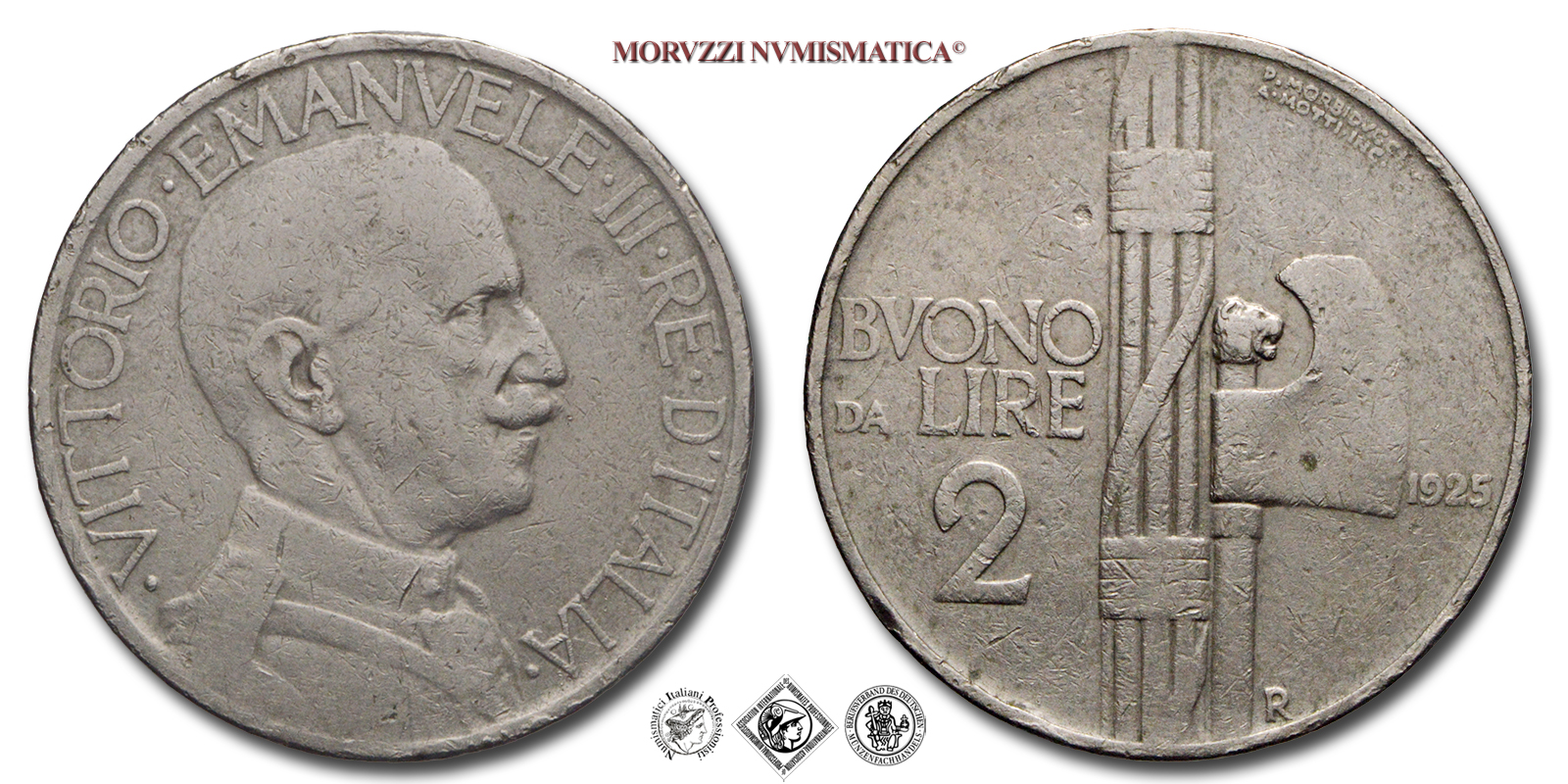 Regno d'Italia, VITTORIO EMANUELE III, 1900-1943, BUONO DA 2 LIRE, Fascio, Emissione: 1925, D/ VITTORIO • EMANUELE • III • RE • D'ITALIA, semibusto del Re volto a d. in uniforme, R/ fascio littorio con scure a d.; nel campo, a s., su tre righe: BUONO DA LIRE 2; nel campo, a d.: il millesimo (1925); in basso, sul lato d. del manico della scure: il segno di zecca (R); a ore 1, sul bordo: i nomi dell'incisore (A • MOTTI INC.) e dell'autore (P • MORBIDUCCI), Zecca di Roma, Rif. bibl. Pagani, 743; Metallo: NI, gr. 10,05, (MI87531), Diam.: mm. 29,04, qBB, (NC)