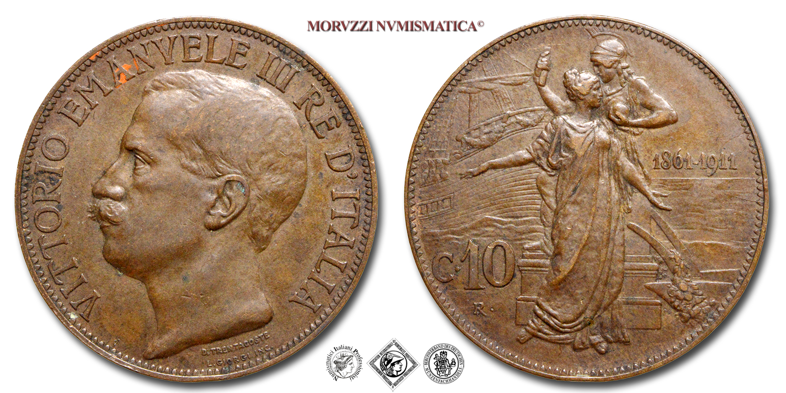Regno d'Italia, VITTORIO EMANUELE III, 1900-1943, CENTESIMI 10, Cinquantenario, Emissione: 1911, D/ VITTORIO EMANUELE III RE D'ITALIA, testa nuda del Re a s.; sotto il collo: i nomi dell'autore (D • TRENTACOSTE) e dell'incisore (L • GIORGI INC •), R/ due figure allegoriche che simboleggiano l'Italia (la figura femminile) e la città di Roma (la figura maschile posta su di un piedistallo al cui lato si intravede un aratro); sullo sfondo: la prora di una nave mercantile; nel campo, a d.: le date 1861-1911; nel campo, a s: l'indicazione del valore (C • 10) e sotto il segno di zecca (R •), Zecca di Roma, Rif. bibl. Pagani, 863; Metallo: CU, gr. 9,97, (MI153038), Diam.: mm. 30,21, mBB