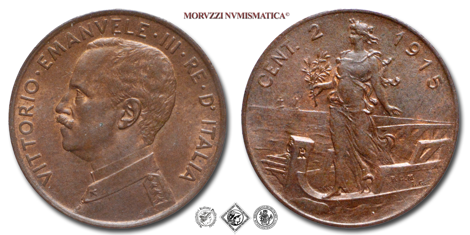 Regno d'Italia, VITTORIO EMANUELE III, 1900-1943, CENTESIMI 2, Italia su prora, Emissione: 1915, D/ VITTORIO • EMANUELE • III • RE • D'ITALIA, semibusto del Re in uniforme e a testa nuda a s., R/ figura allegorica femminile simboleggiante l'Italia su di una nave con un ramoscello di ulivo nella mano d.; sulla prua della nave: segno di zecca in incuso (R); sulla fiancata: le iniziali degli autori P.C.M. (Pietro Canonica modellò) e L.G.I. (Luigi Giorgi incise) in incuso; in alto, lungo il bordo: indicazione del valore (CENT. 2) e millesimo (1915), Zecca di Roma, Rif. bibl. Pagani, 937; Metallo: CU, gr. 2,01, (MI118773), Diam.: mm. 20,12, mSPL