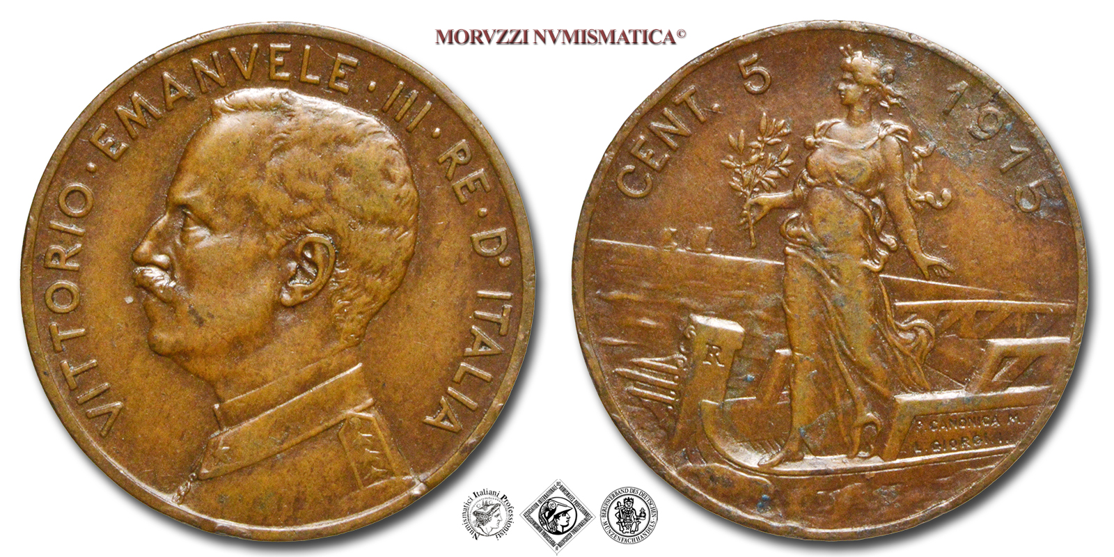 Regno d'Italia, VITTORIO EMANUELE III, 1900-1943, CENTESIMI 5, Italia su prora, Emissione: 1915, D/ VITTORIO • EMANUELE • III • RE • D'ITALIA, semibusto del Re in uniforme e a testa nuda a s., R/ figura allegorica femminile simboleggiante l'Italia su di una nave con un ramoscello di ulivo nella mano d.; sulla prua della nave: segno di zecca in incuso (R); sulla fiancata: le iniziali degli autori P.C.M. (Pietro Canonica modellò) e L.G.I. (Luigi Giorgi incise) in incuso; in alto, lungo il bordo: indicazione del valore (CENT. 5) e millesimo (1915), Zecca di Roma, Rif. bibl. Pagani, 896; Metallo: CU, gr. 4,95, (MI162142), Diam.: mm. 24,94, BB