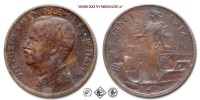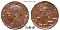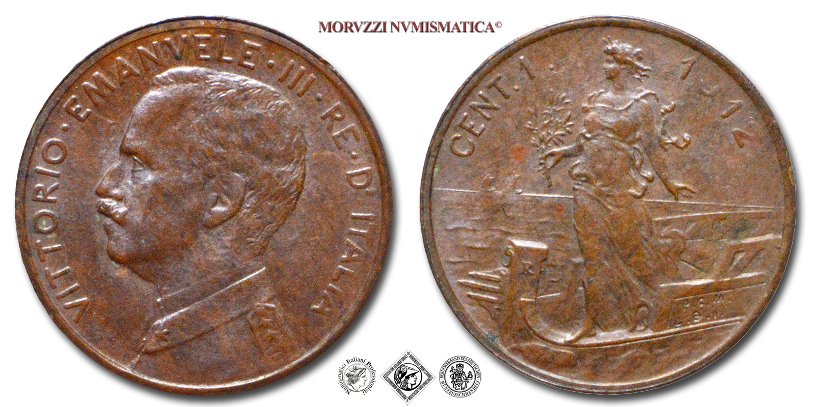 Regno d'Italia, VITTORIO EMANUELE III, 1900-1943, CENTESIMO, Italia su prora, Emissione: 1912, D/ VITTORIO • EMANUELE • III • RE • D'ITALIA, semibusto del Re in uniforme a s., R/ Figura allegorica femminile simboleggiante l'Italia su di una nave con un ramoscello di ulivo nella mano destra. Sulla prua della nave R in rilievo (Roma), sulla fiancata le iniziali in incuso degli autori P.C.M. (Pietro Canonica) e L.G.I. (Luigi Giorgi). In alto, lungo il bordo: il valore (CENT. 1) e il millesimo (1912), Zecca di Roma, Rif. bibl. Pagani, 949; Metallo: CU, gr. 0,94, (MI96163), Diam.: mm. 15,11, qSPL