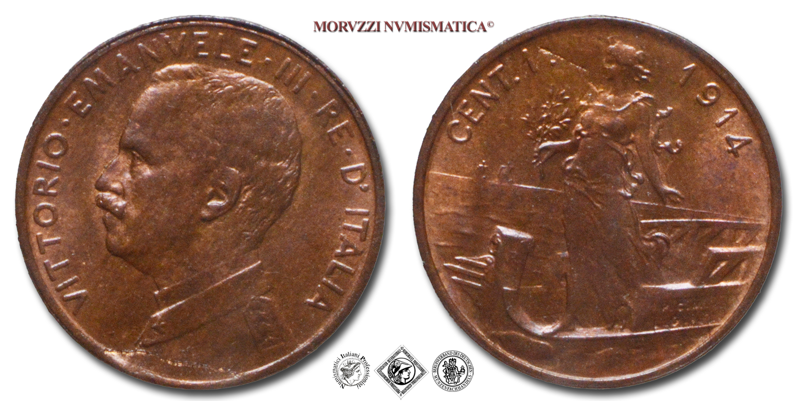 Regno d'Italia, VITTORIO EMANUELE III, 1900-1943, CENTESIMO, Italia su prora, Emissione: 1914, D/ VITTORIO • EMANUELE • III • RE • D'ITALIA, semibusto del Re in uniforme a s., R/ Figura allegorica femminile simboleggiante l'Italia su di una nave con un ramoscello di ulivo nella mano destra. Sulla prua della nave R in rilievo (Roma), sulla fiancata le iniziali in incuso degli autori P.C.M. (Pietro Canonica) e L.G.I. (Luigi Giorgi). In alto, lungo il bordo: il valore (CENT. 1) e il millesimo (1914), Zecca di Roma, Rif. bibl. Pagani, 951; Metallo: CU, gr. 1,01, (MI158384), Diam.: mm. 15,08, FDC