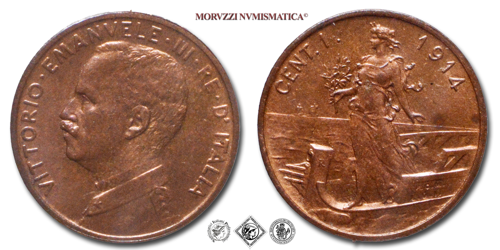 Regno d'Italia, VITTORIO EMANUELE III, 1900-1943, CENTESIMO, Italia su prora, Emissione: 1914, D/ VITTORIO • EMANUELE • III • RE • D'ITALIA, semibusto del Re in uniforme a s., R/ Figura allegorica femminile simboleggiante l'Italia su di una nave con un ramoscello di ulivo nella mano destra. Sulla prua della nave R in rilievo (Roma), sulla fiancata le iniziali in incuso degli autori P.C.M. (Pietro Canonica) e L.G.I. (Luigi Giorgi). In alto, lungo il bordo: il valore (CENT. 1) e il millesimo (1914), Zecca di Roma, Rif. bibl. Pagani, 951; Metallo: CU, gr. 0,99, (MI158386), Diam.: mm. 15,04, qFDC