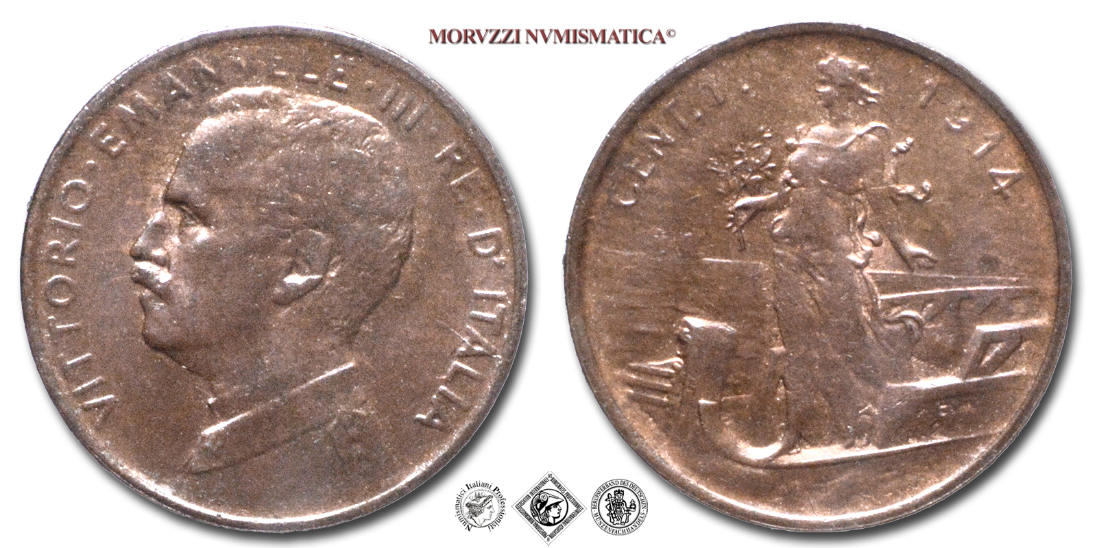 Regno d'Italia, VITTORIO EMANUELE III, 1900-1943, CENTESIMO, Italia su prora, Emissione: 1914, D/ VITTORIO • EMANUELE • III • RE • D'ITALIA, semibusto del Re in uniforme a s., R/ Figura allegorica femminile simboleggiante l'Italia su di una nave con un ramoscello di ulivo nella mano destra. Sulla prua della nave R in rilievo (Roma), sulla fiancata le iniziali in incuso degli autori P.C.M. (Pietro Canonica) e L.G.I. (Luigi Giorgi). In alto, lungo il bordo: il valore (CENT. 1) e il millesimo (1914), Zecca di Roma, Rif. bibl. Pagani, 951; Metallo: CU, gr. 1,00, (MI158393), Diam.: mm. 15,06, qFDC