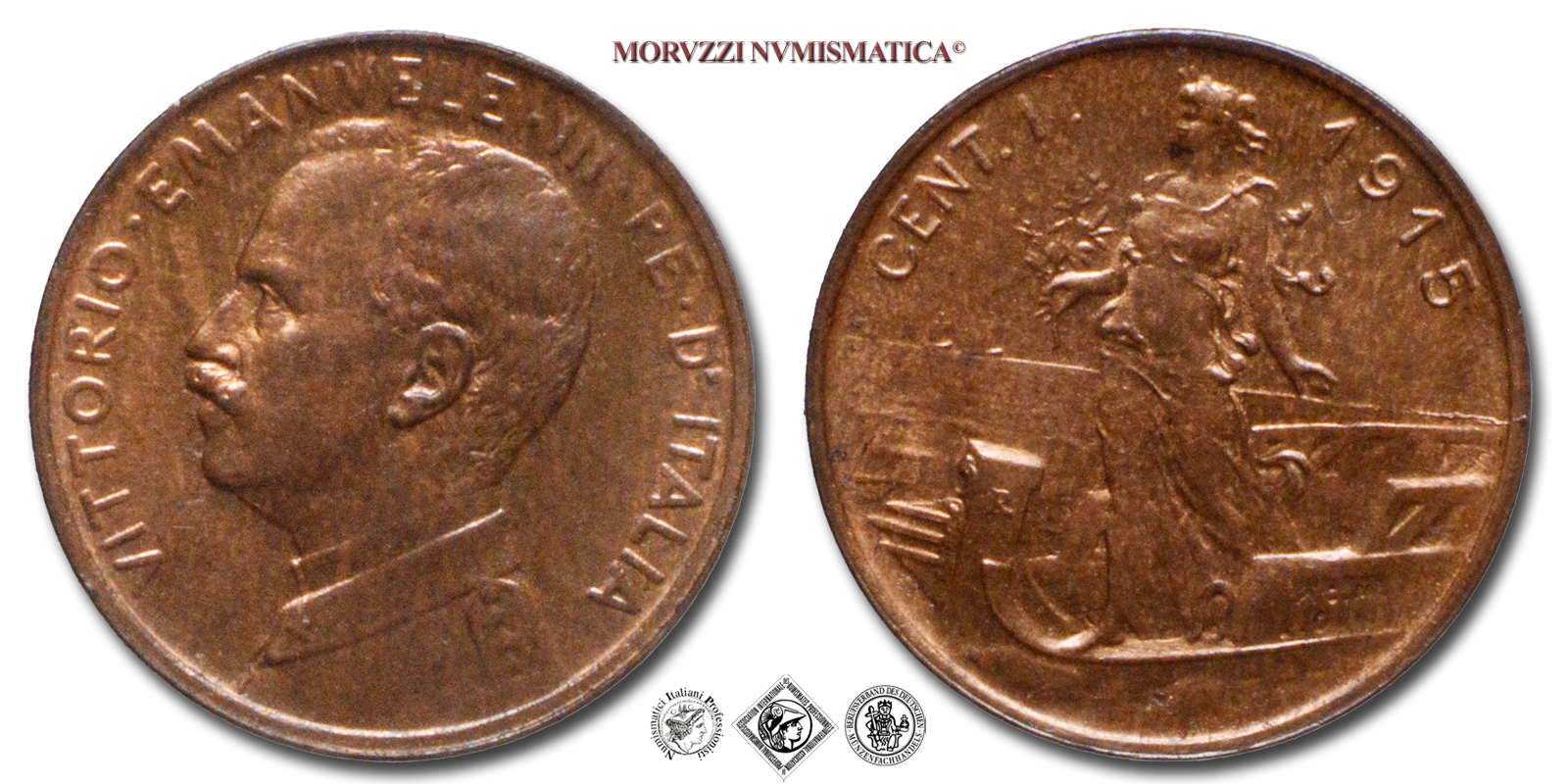 Regno d'Italia, VITTORIO EMANUELE III, 1900-1943, CENTESIMO, Italia su prora, Emissione: 1915, D/ VITTORIO • EMANUELE • III • RE • D'ITALIA, semibusto del Re in uniforme a s., R/ Figura allegorica femminile simboleggiante l'Italia su di una nave con un ramoscello di ulivo nella mano destra. Sulla prua della nave R in rilievo (Roma), sulla fiancata le iniziali in incuso degli autori P.C.M. (Pietro Canonica) e L.G.I. (Luigi Giorgi). In alto, lungo il bordo: il valore (CENT. 1) e il millesimo (1915), Zecca di Roma, Rif. bibl. Pagani, 952; Metallo: CU, gr. 1,03, (MI158404), Diam.: mm. 15,07, qFDC