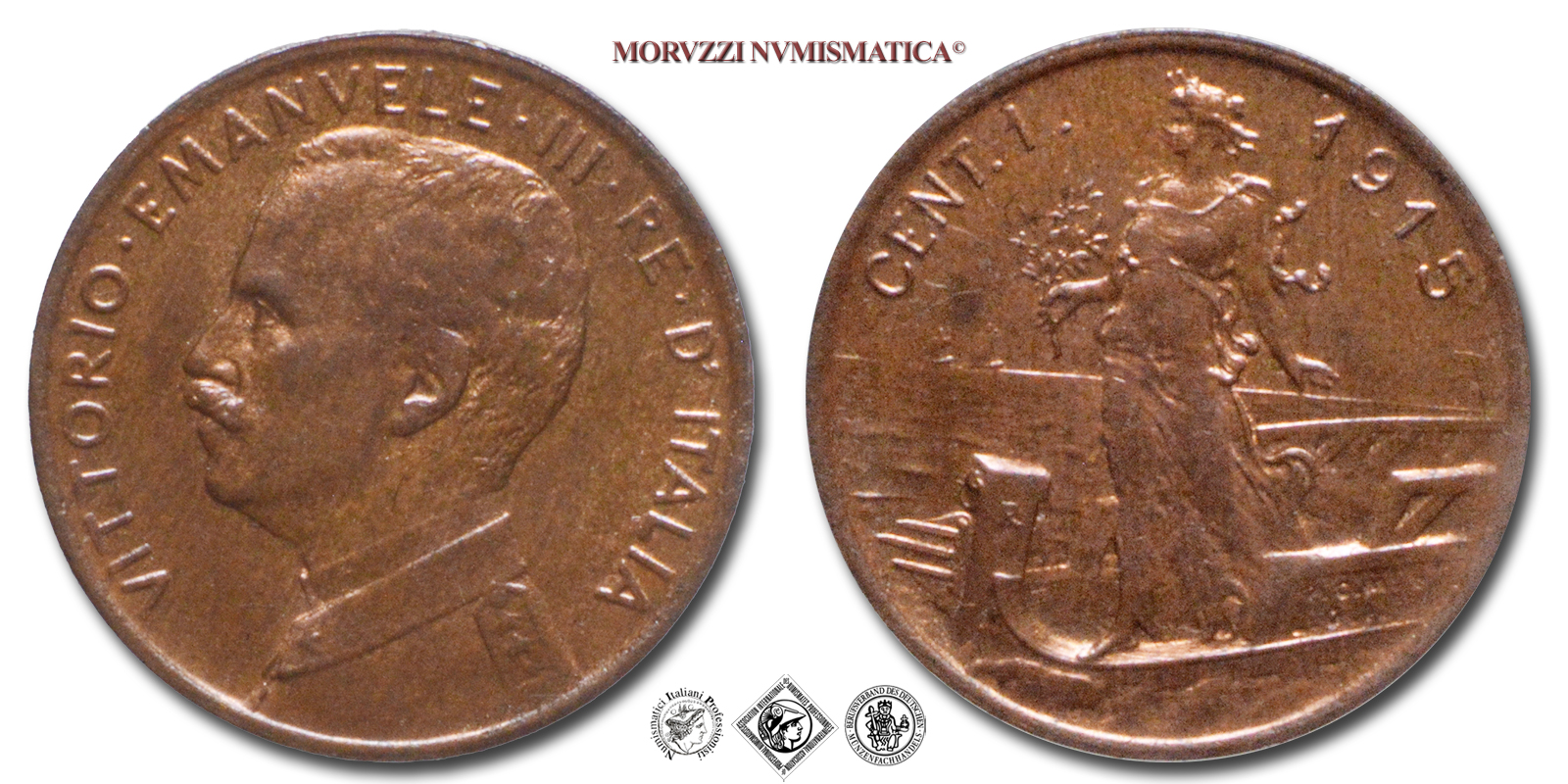 Regno d'Italia, VITTORIO EMANUELE III, 1900-1943, CENTESIMO, Italia su prora, Emissione: 1915, D/ VITTORIO • EMANUELE • III • RE • D'ITALIA, semibusto del Re in uniforme a s., R/ Figura allegorica femminile simboleggiante l'Italia su di una nave con un ramoscello di ulivo nella mano destra. Sulla prua della nave R in rilievo (Roma), sulla fiancata le iniziali in incuso degli autori P.C.M. (Pietro Canonica) e L.G.I. (Luigi Giorgi). In alto, lungo il bordo: il valore (CENT. 1) e il millesimo (1915), Zecca di Roma, Rif. bibl. Pagani, 952; Metallo: CU, gr. 0,99, (MI158409), Diam.: mm. 15,01, qFDC
