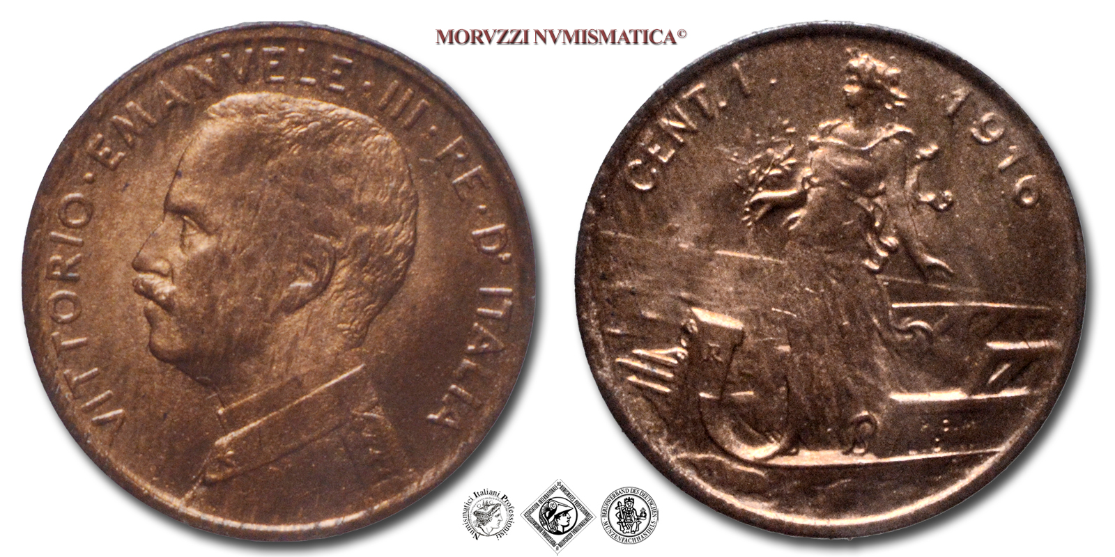 Regno d'Italia, VITTORIO EMANUELE III, 1900-1943, CENTESIMO, Italia su prora, Emissione: 1916, D/ VITTORIO • EMANUELE • III • RE • D'ITALIA, semibusto del Re in uniforme a s., R/ Figura allegorica femminile simboleggiante l'Italia su di una nave con un ramoscello di ulivo nella mano destra. Sulla prua della nave R in rilievo (Roma), sulla fiancata le iniziali in incuso degli autori P.C.M. (Pietro Canonica) e L.G.I. (Luigi Giorgi). In alto, lungo il bordo: il valore (CENT. 1) e il millesimo (1916), Zecca di Roma, Rif. bibl. Pagani, 953; Metallo: CU, gr. 0,96, (MI158426), Diam.: mm. 15,09, FDC