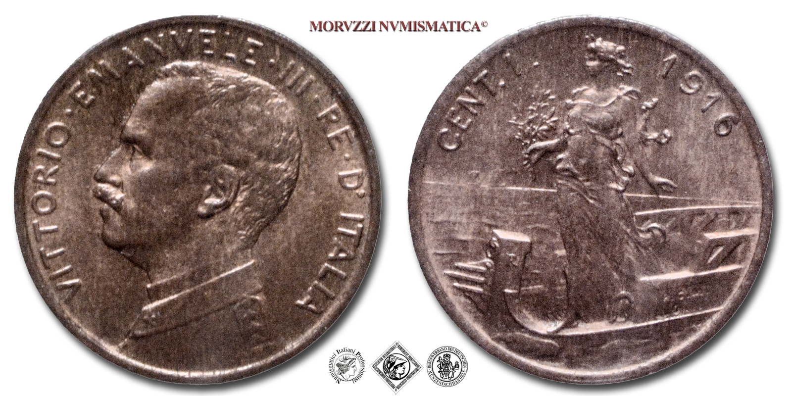 Regno d'Italia, VITTORIO EMANUELE III, 1900-1943, CENTESIMO, Italia su prora, Emissione: 1916, D/ VITTORIO • EMANUELE • III • RE • D'ITALIA, semibusto del Re in uniforme a s., R/ Figura allegorica femminile simboleggiante l'Italia su di una nave con un ramoscello di ulivo nella mano destra. Sulla prua della nave R in rilievo (Roma), sulla fiancata le iniziali in incuso degli autori P.C.M. (Pietro Canonica) e L.G.I. (Luigi Giorgi). In alto, lungo il bordo: il valore (CENT. 1) e il millesimo (1916), Zecca di Roma, Rif. bibl. Pagani, 953; Metallo: CU, gr. 0,98, (MI158427), Diam.: mm. 15,07, FDC