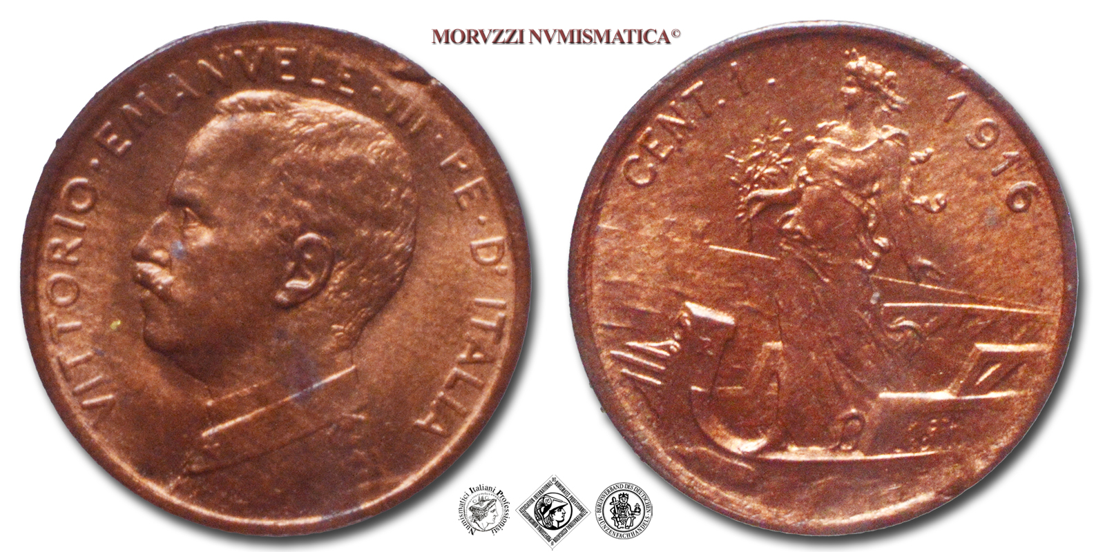 Regno d'Italia, VITTORIO EMANUELE III, 1900-1943, CENTESIMO, Italia su prora, Emissione: 1916, D/ VITTORIO • EMANUELE • III • RE • D'ITALIA, semibusto del Re in uniforme a s., R/ Figura allegorica femminile simboleggiante l'Italia su di una nave con un ramoscello di ulivo nella mano destra. Sulla prua della nave R in rilievo (Roma), sulla fiancata le iniziali in incuso degli autori P.C.M. (Pietro Canonica) e L.G.I. (Luigi Giorgi). In alto, lungo il bordo: il valore (CENT. 1) e il millesimo (1916), Zecca di Roma, Rif. bibl. Pagani, 953; Metallo: CU, gr. 1,00, (MI158420), Diam.: mm. 15,16, qFDC