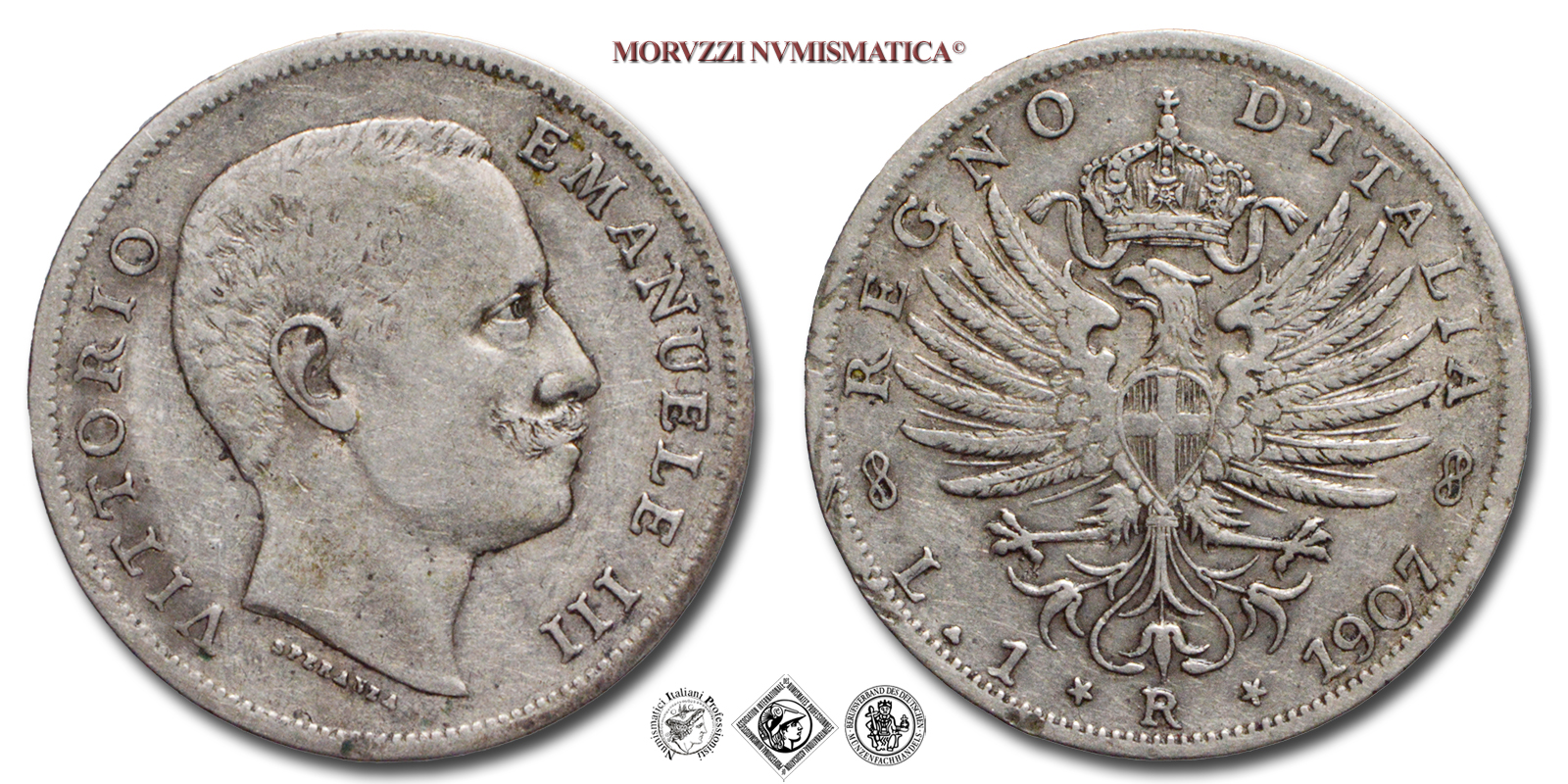 Regno d'Italia, VITTORIO EMANUELE III, 1900-1943, LIRA, Aquila Sabauda, Emissione: 1907, D/ VITTORIO EMANUELE III, testa nuda del Re a d.; sotto il collo: il nome dell'incisore (SPERANZA), R/ REGNO D'ITALIA, aquila araldica con stemma di casa Savoia; sotto: l'indicazione del valore (L • 1), il segno di zecca (R) tra due stelle a cinque punte e il millesimo (1907), Zecca di Roma, Rif. bibl. Pagani, 767; Metallo: AR, gr. 4,91, (MI122214), Diam.: mm. 23,20, BB